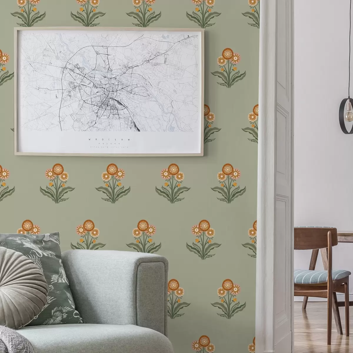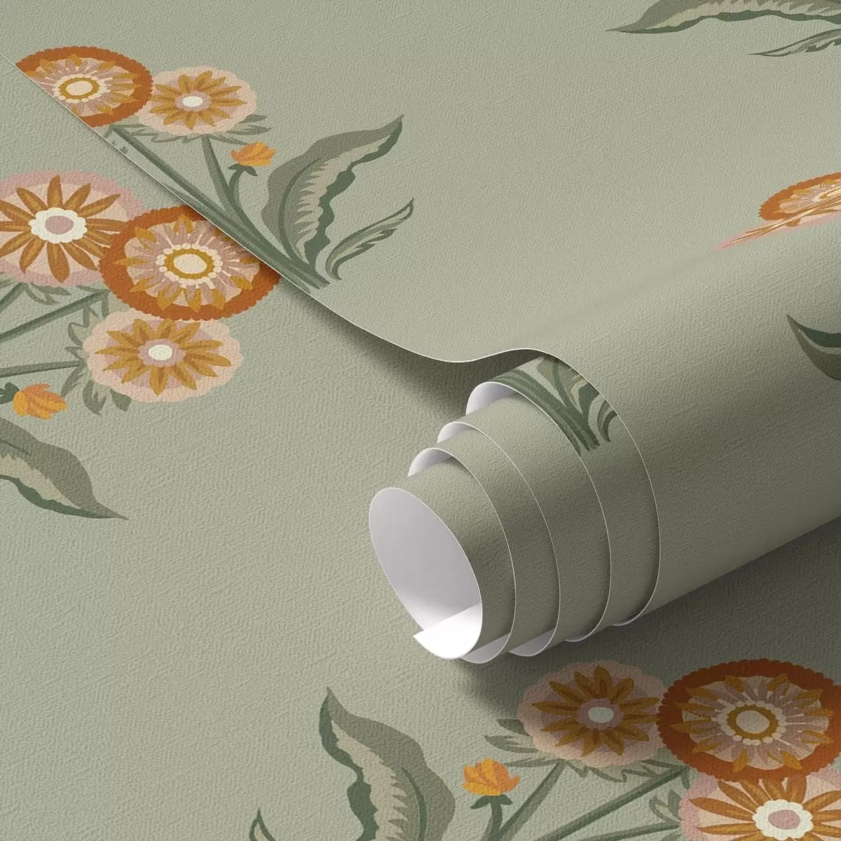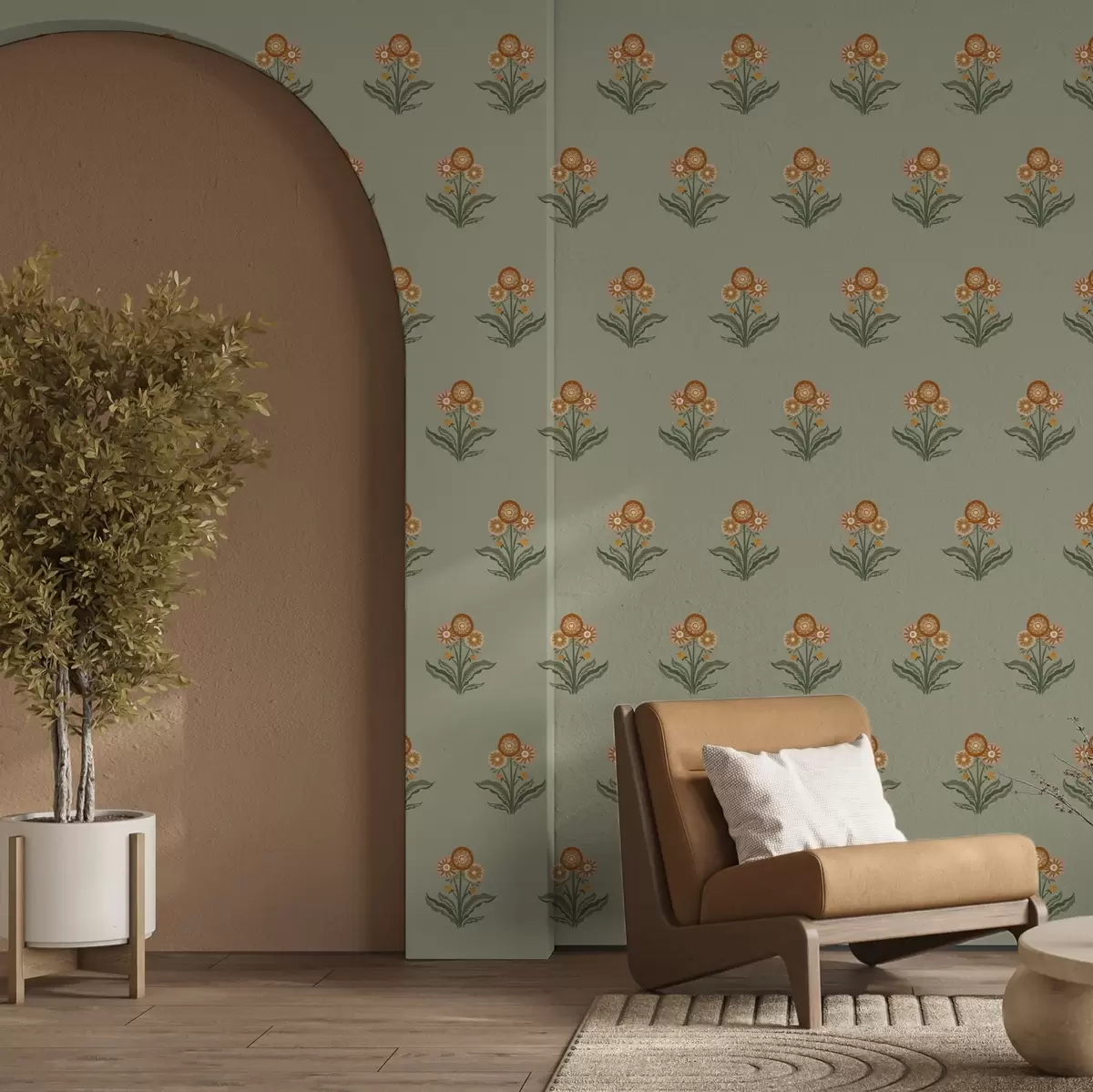 Papel de parede Flores estilizadas sobre fundo verde-oliva, tons quentes Nr. a00494v2