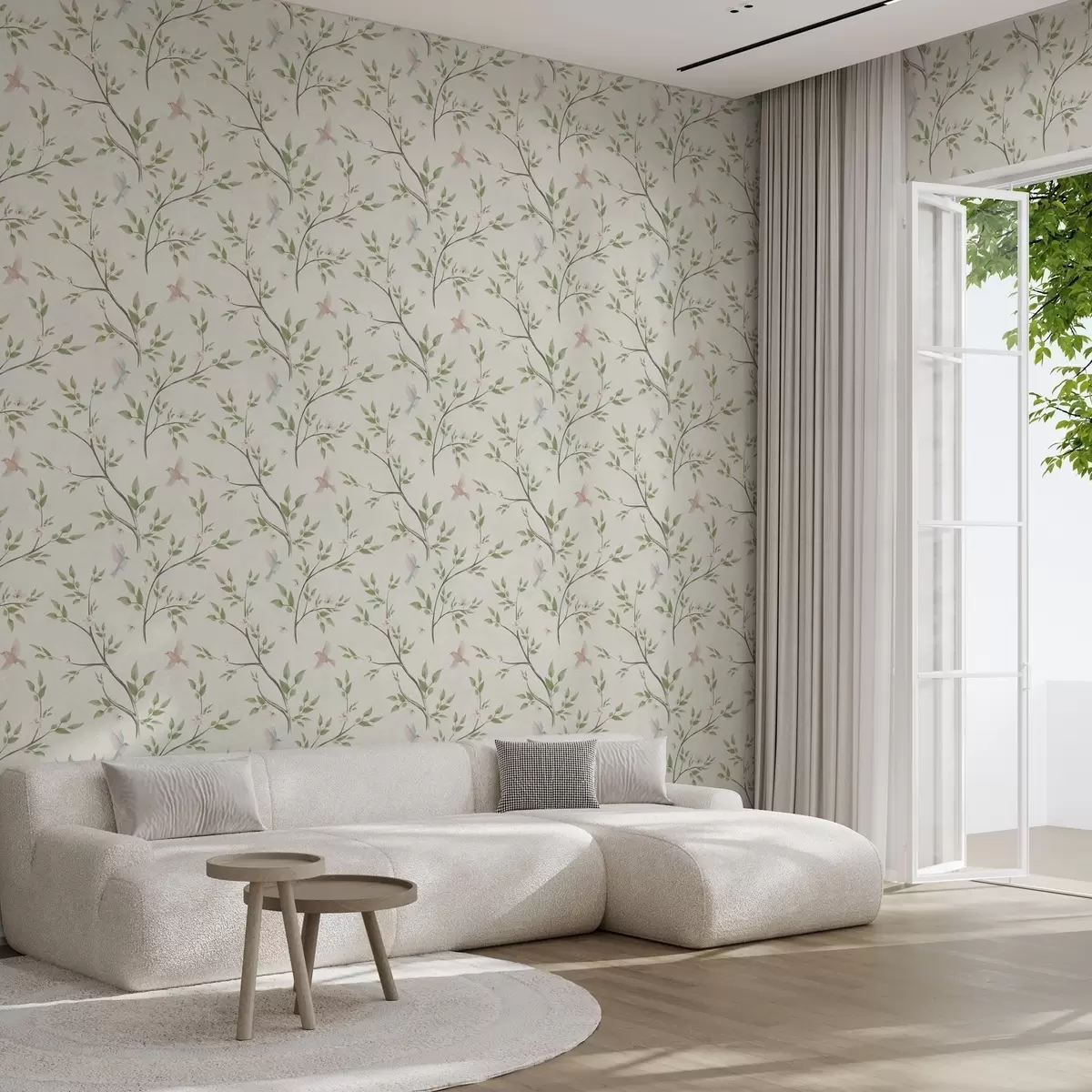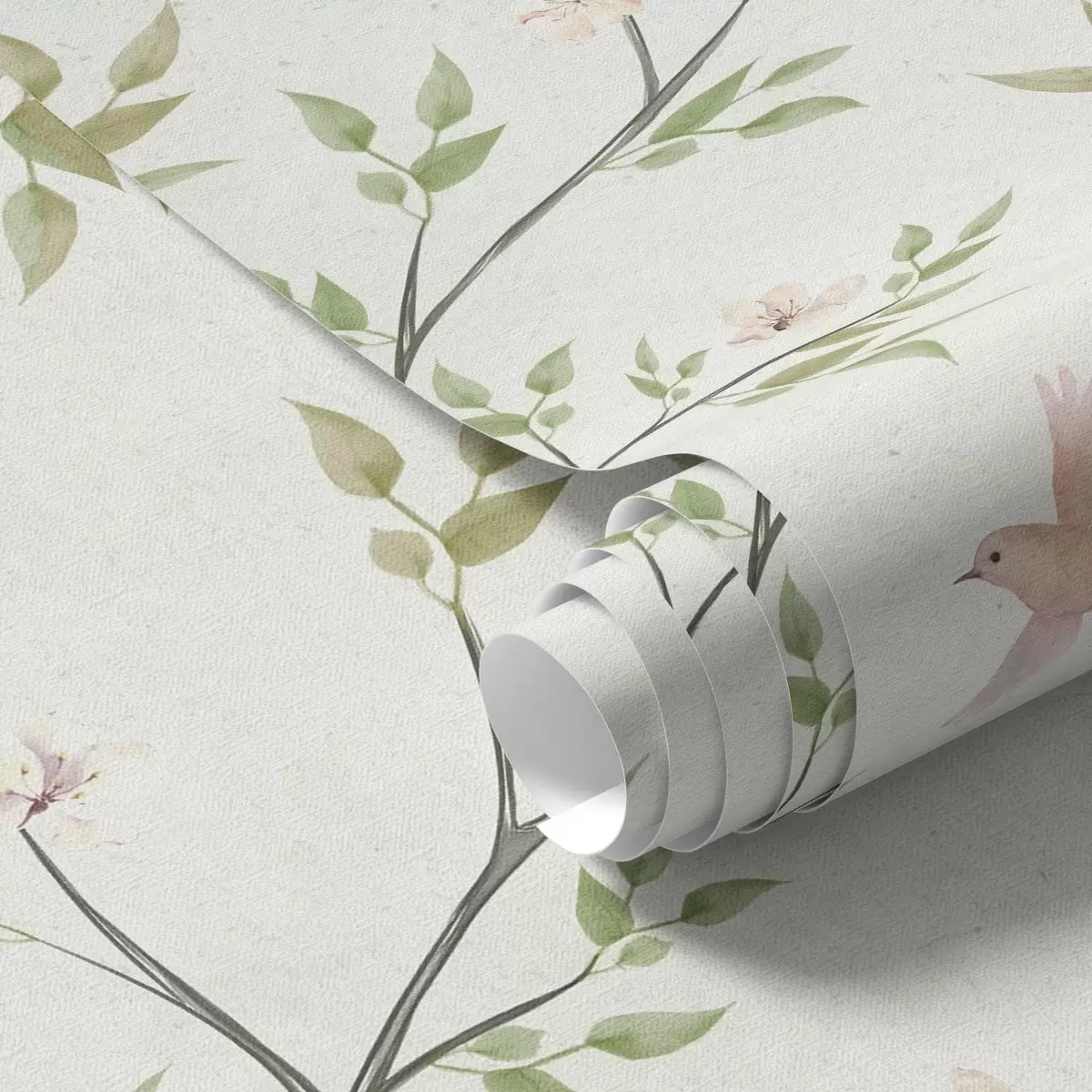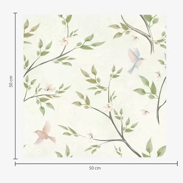 Papel de parede Galhos em aquarela com folhas e pássaros sobre um fundo claro Nr. a00496