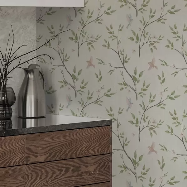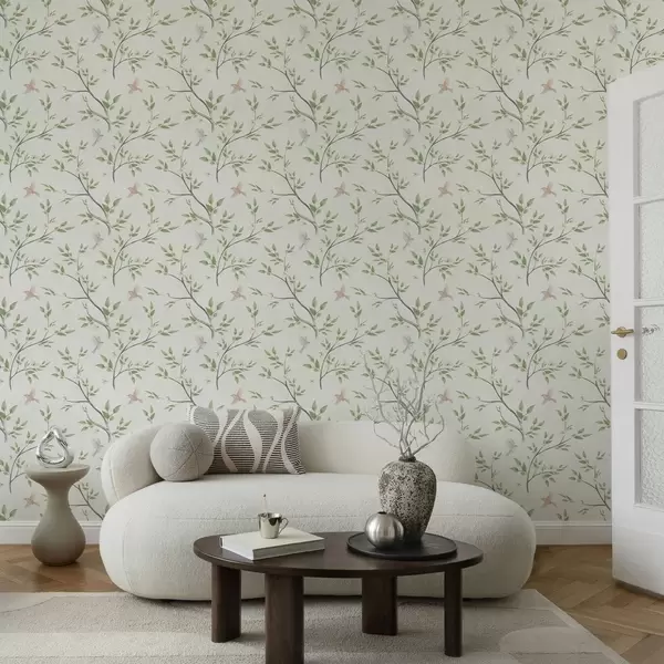 Papel de parede Galhos em aquarela com folhas e pássaros sobre um fundo claro Nr. a00496