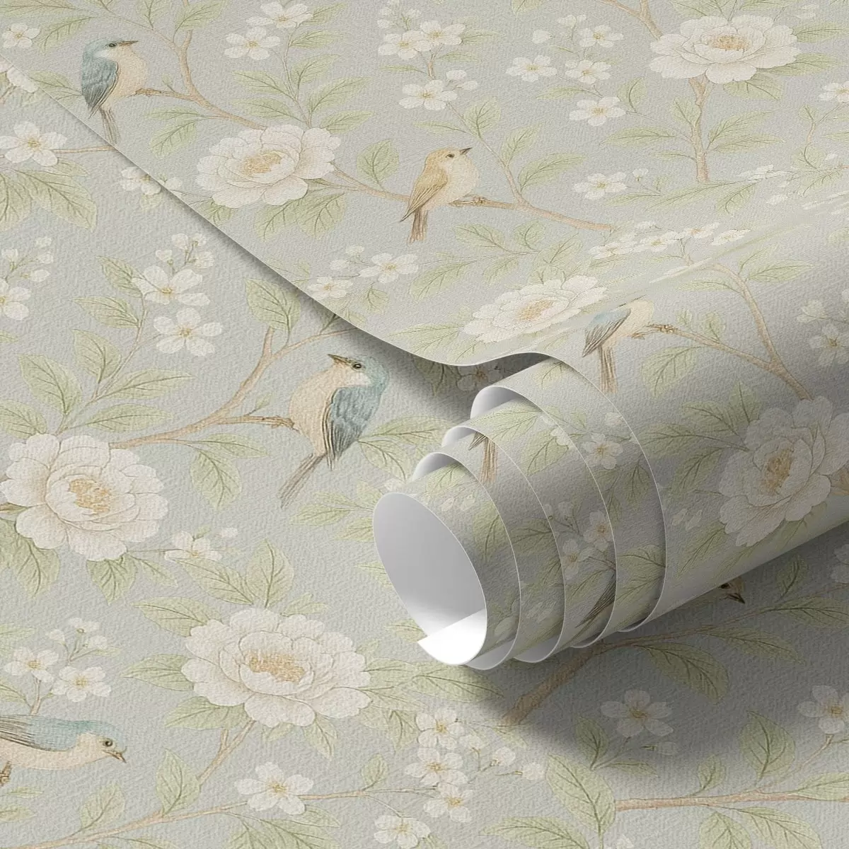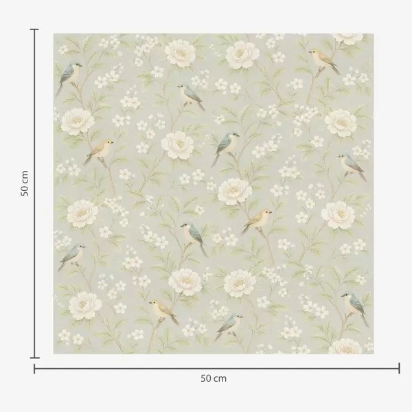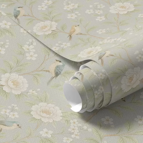 Papel de parede Pássaros entre flores brancas num fundo cinza-esverdeado Nr. a00583