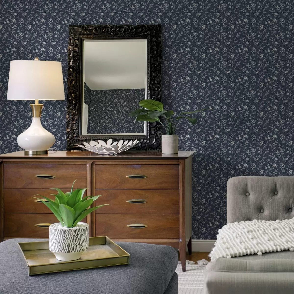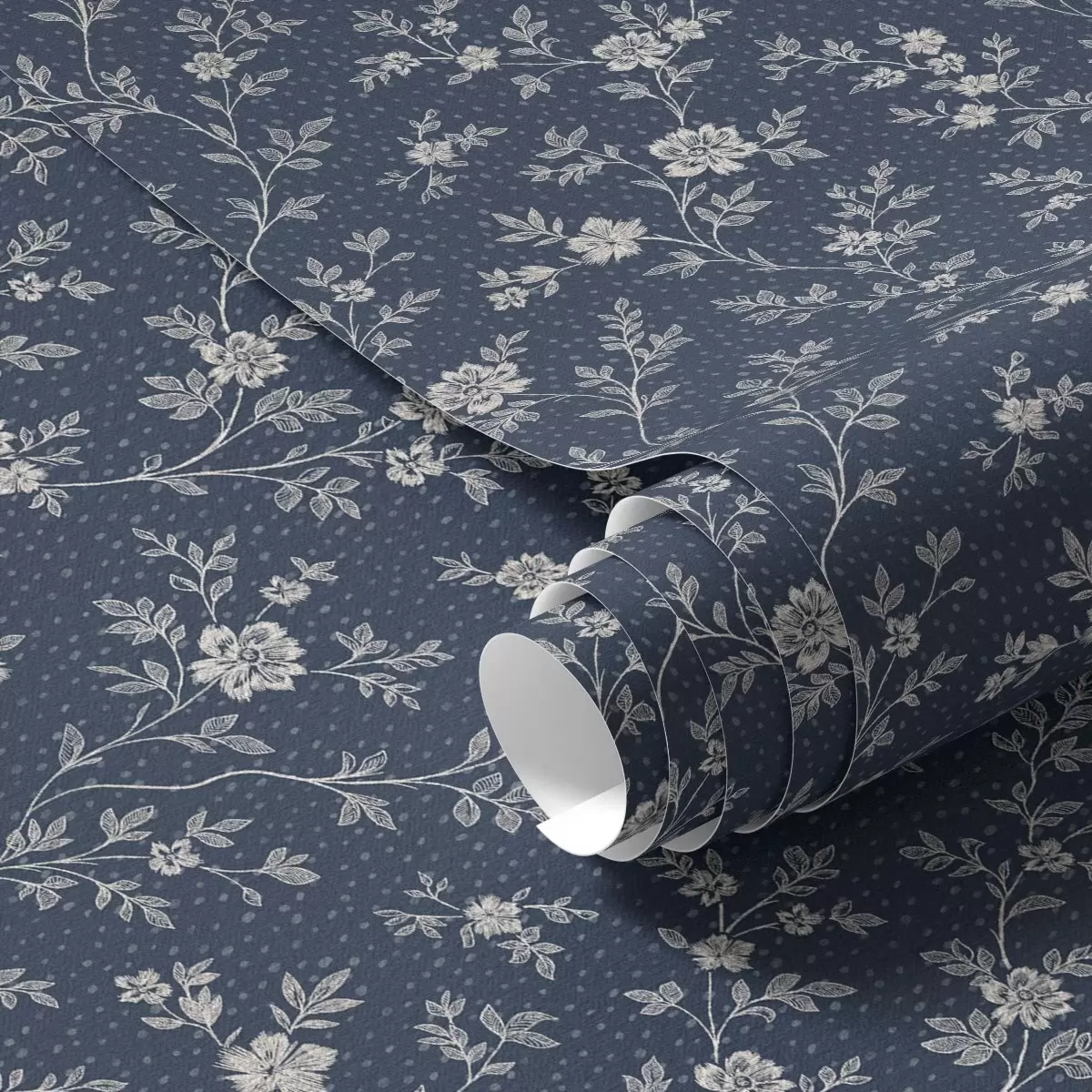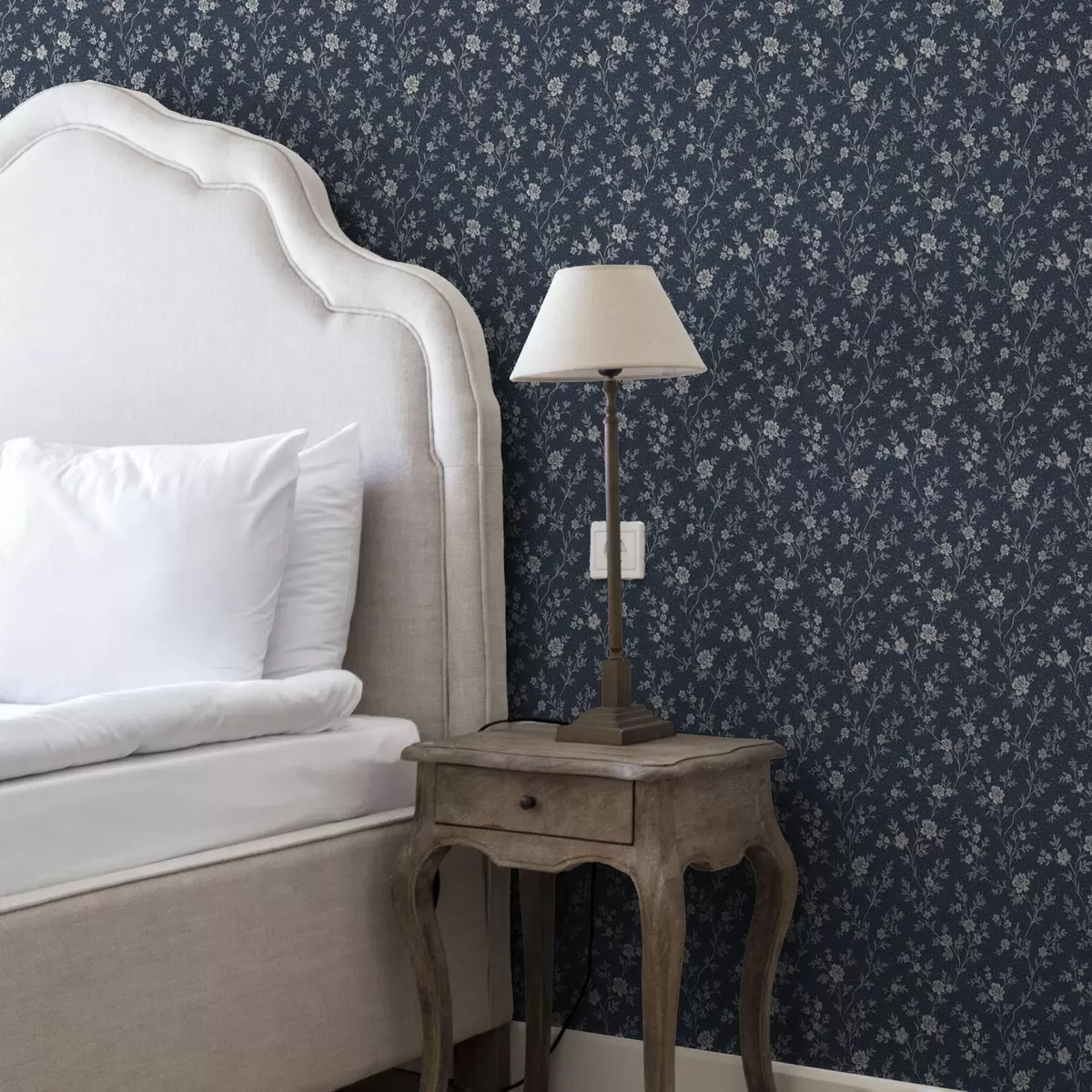 Papel de parede Fundo azul-marinho escuro com finos ramos e flores bege Nr. a00612