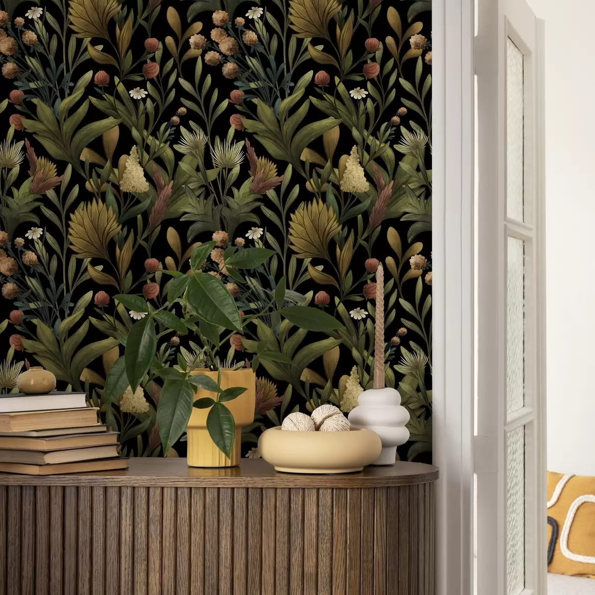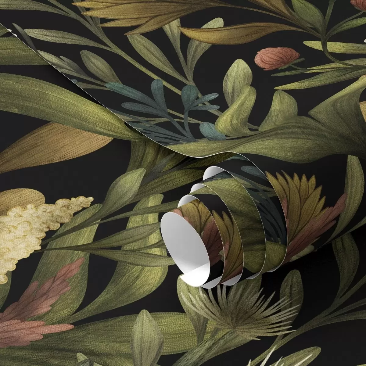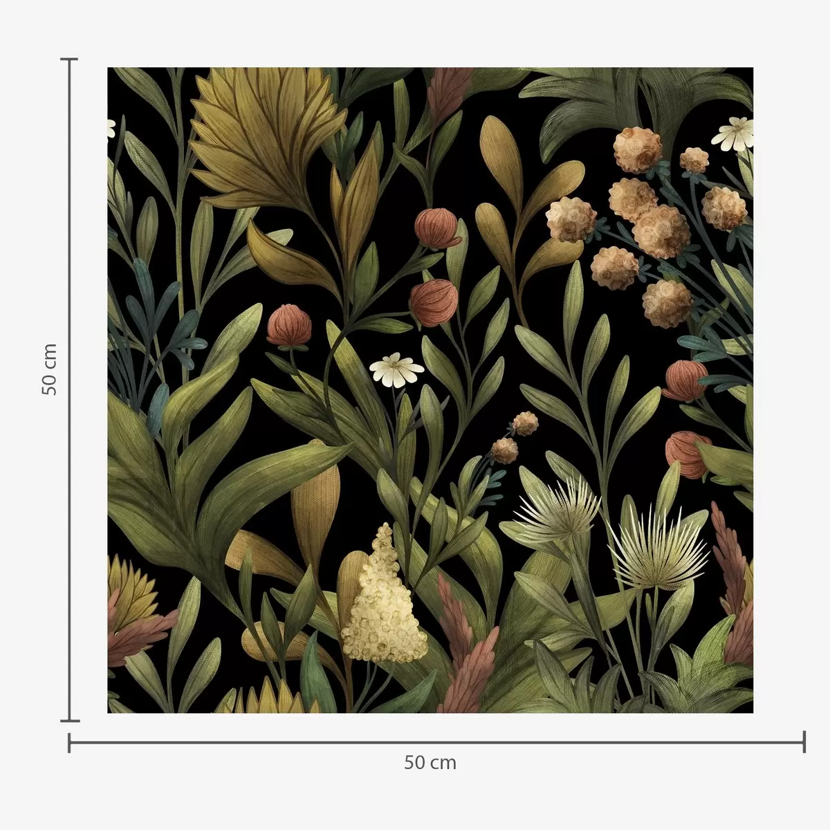 Papel de parede Jardim botânico sobre fundo preto, paleta de cores quentes do outono Nr. a00619
