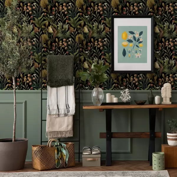 Papel de parede Jardim botânico sobre fundo preto, paleta de cores quentes do outono Nr. a00619