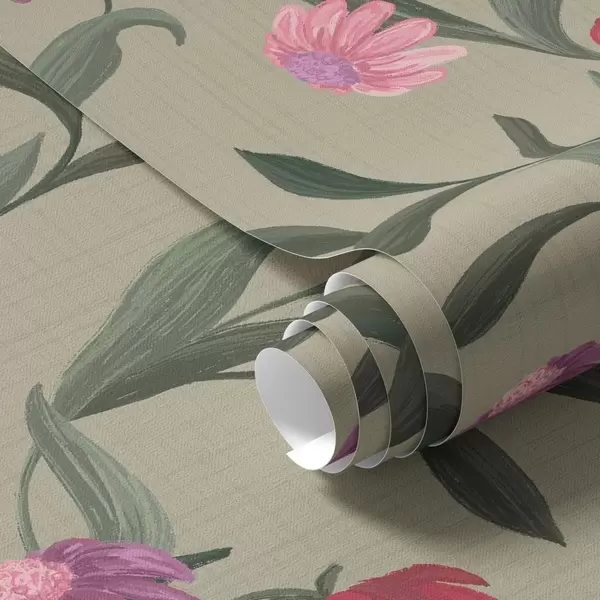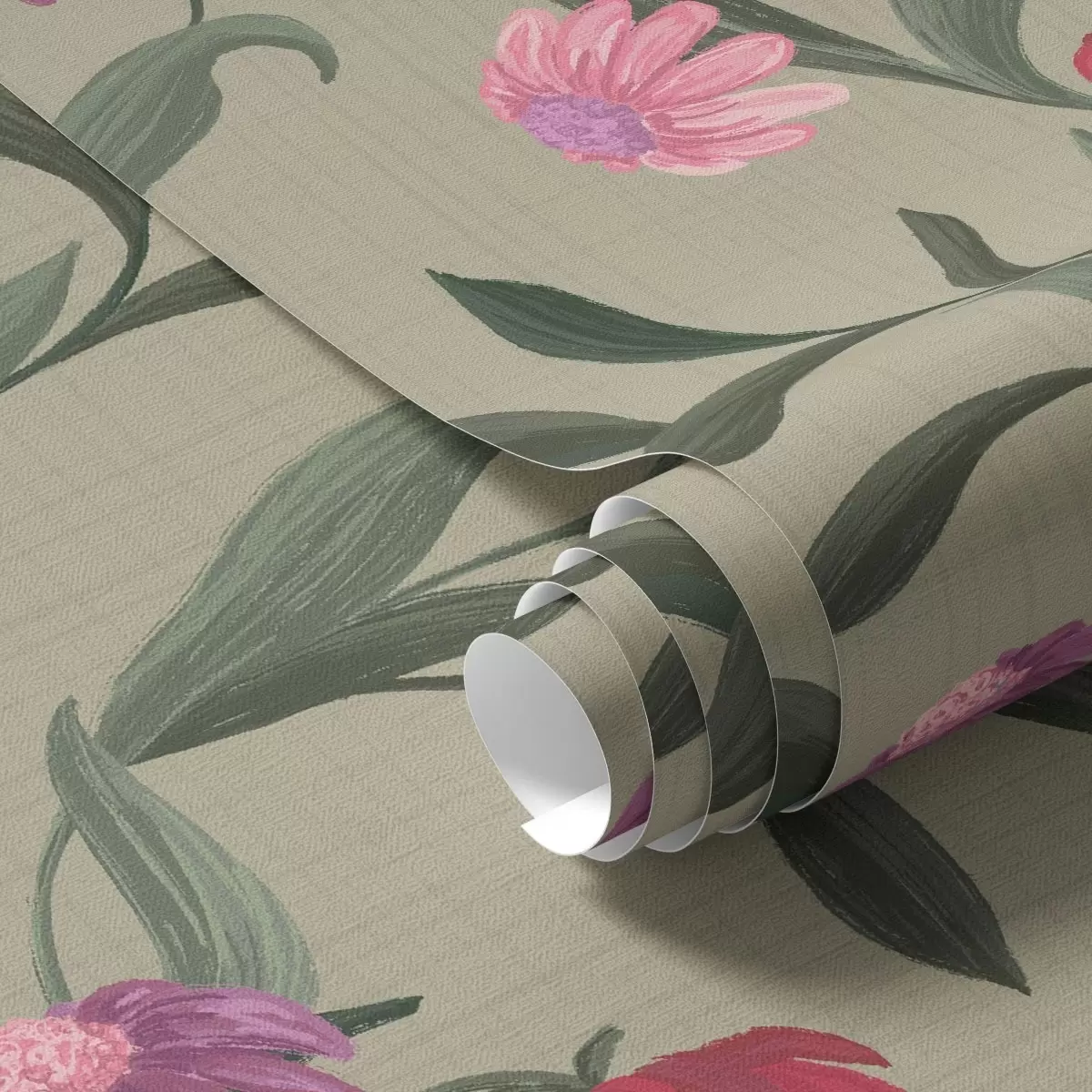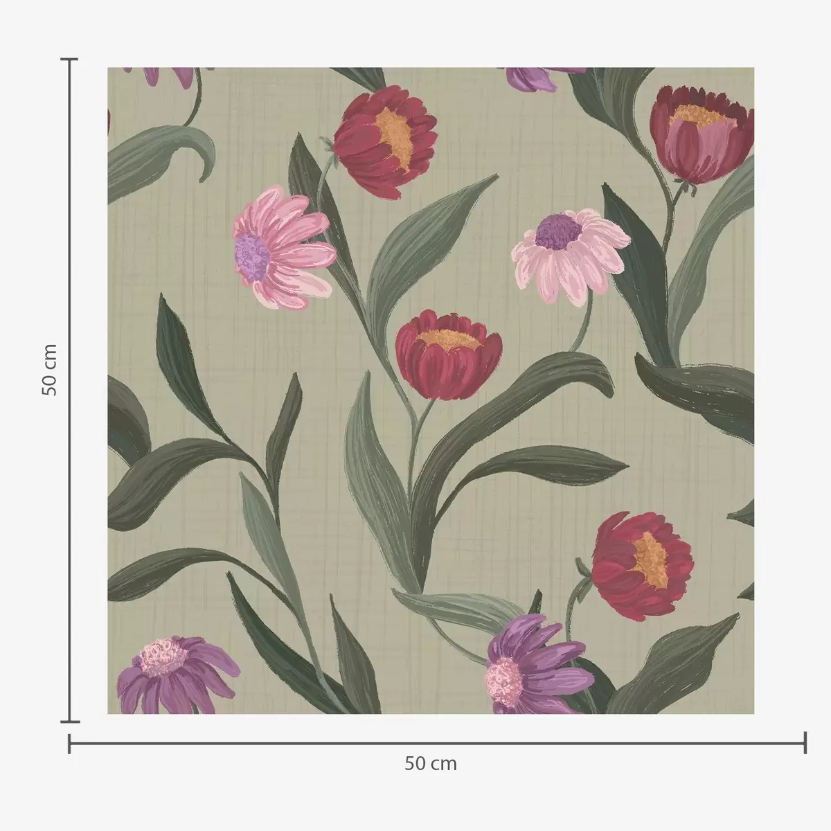 Papel de parede Flores rosa-avermelhadas sobre fundo verde-oliva, textura de tela Nr. a00631v1