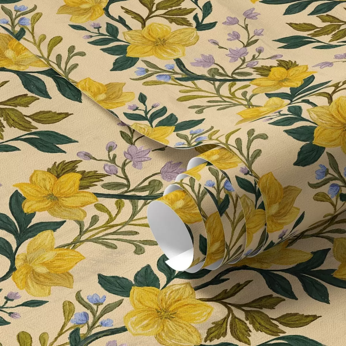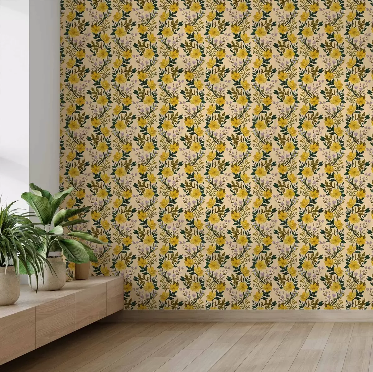 Papel de parede Flores amarelas em guirlandas verticais sobre fundo creme a00632
