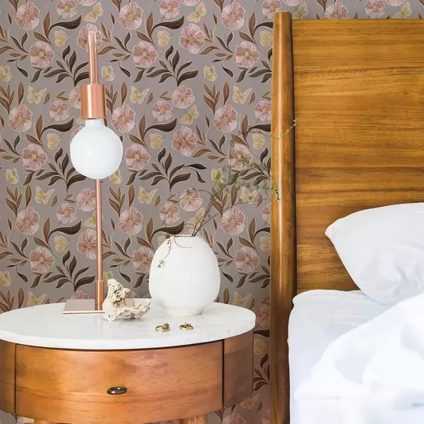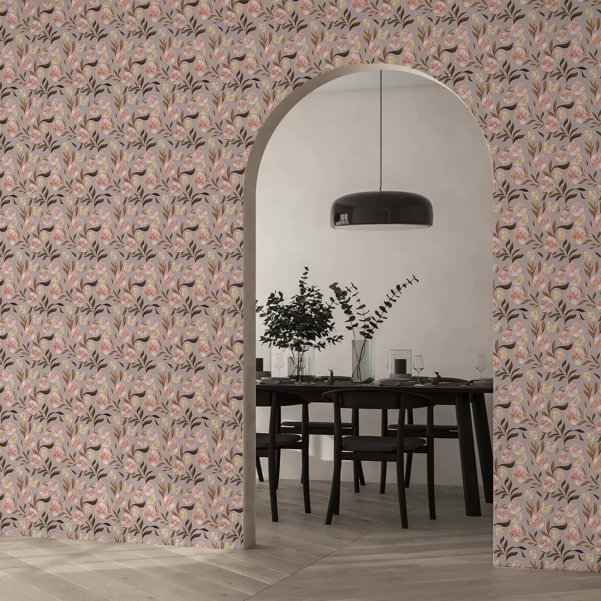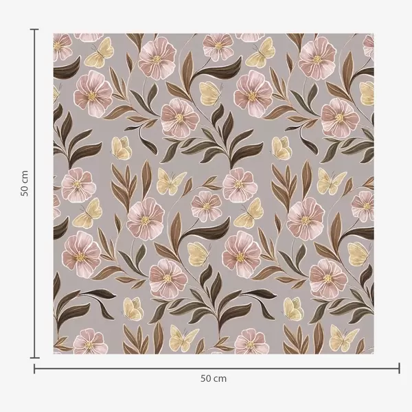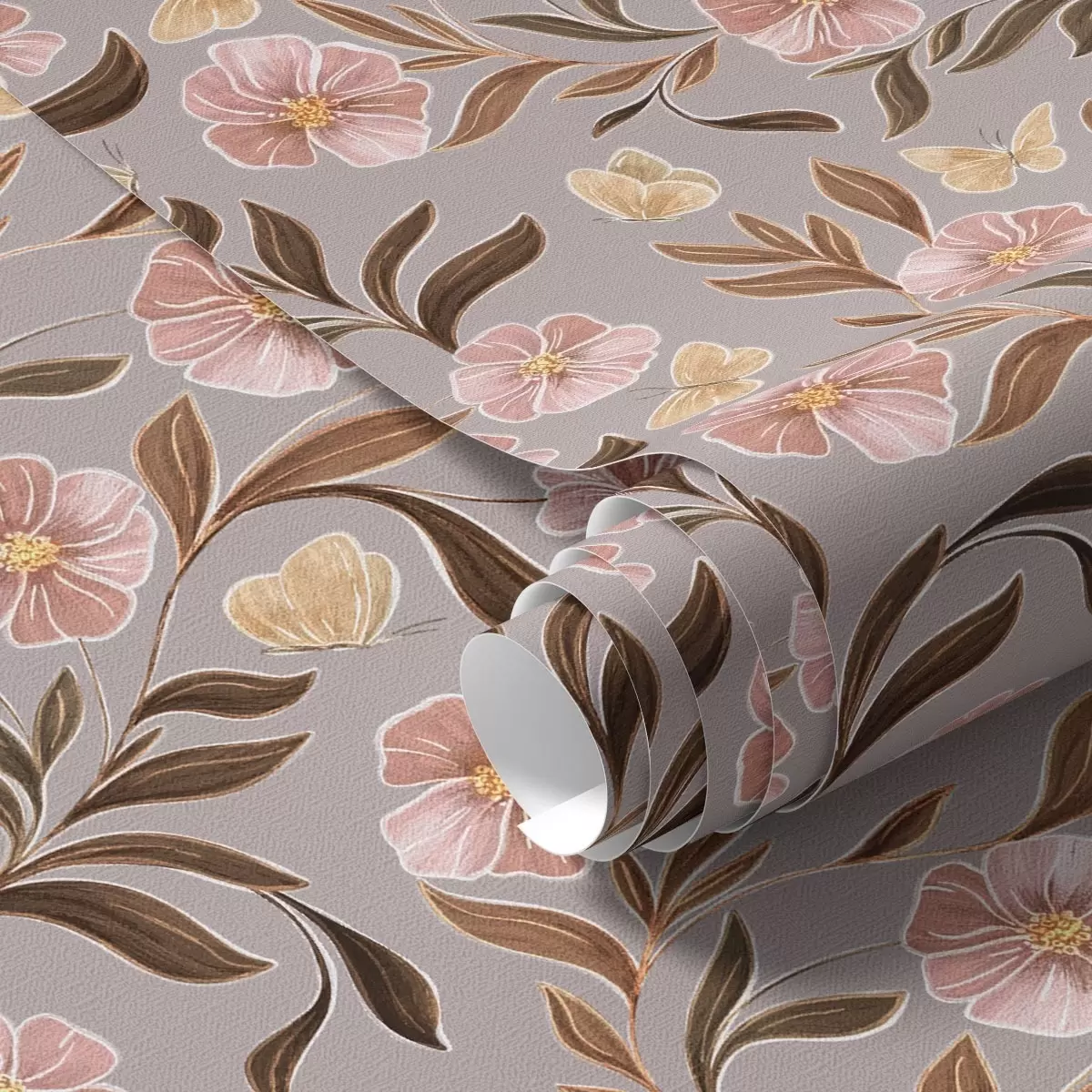 Papel de parede Flores cor-de-rosa e borboletas sobre um fundo cinza-bege Nr. a00633