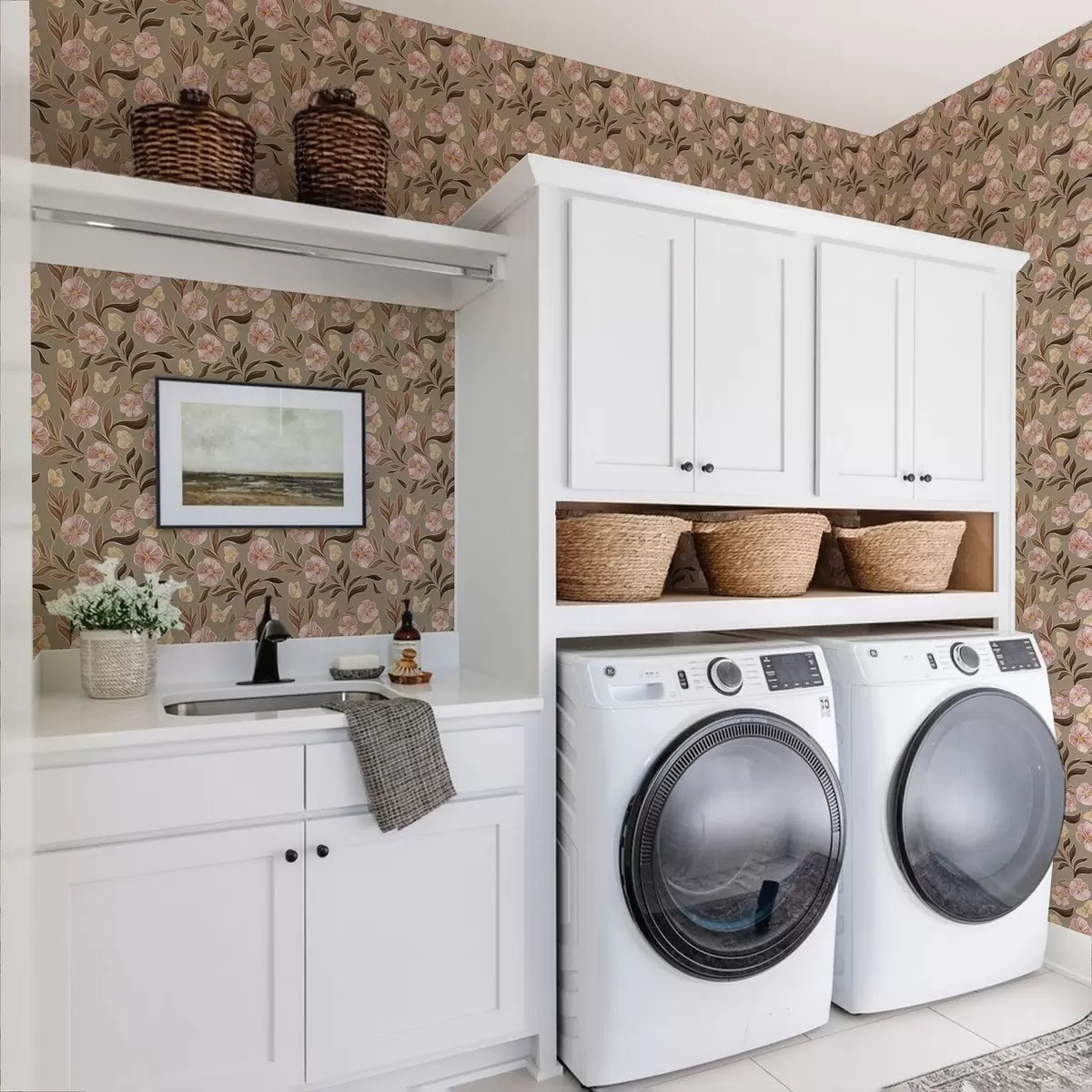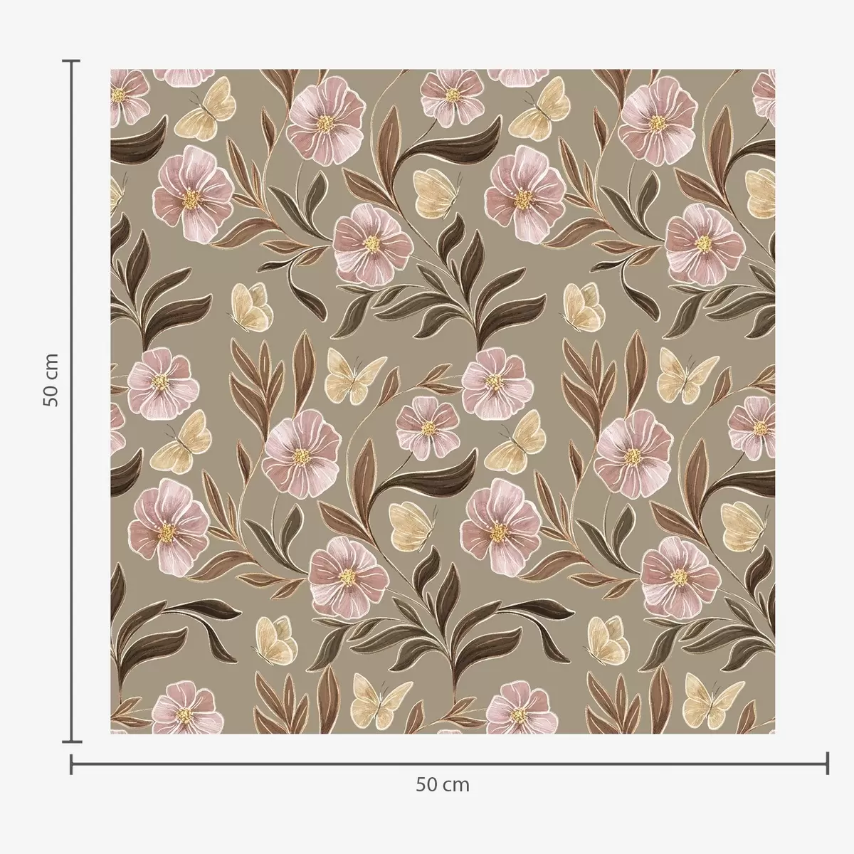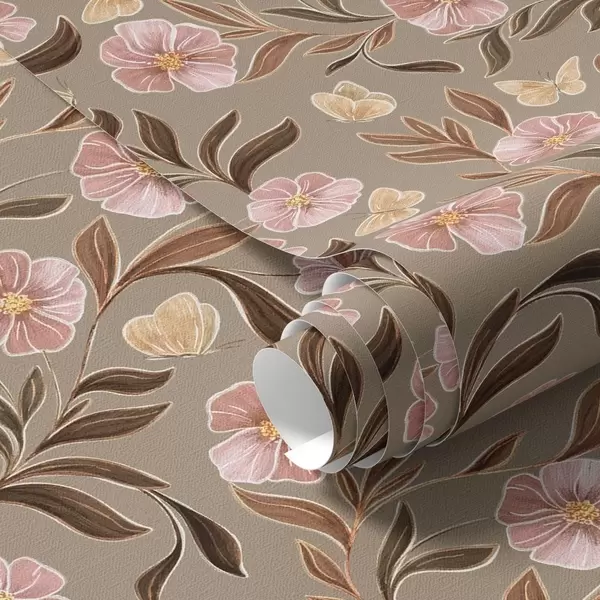 Papel de parede Flores cor-de-rosa e borboletas sobre um fundo bege-azeitona Nr. a00633v2