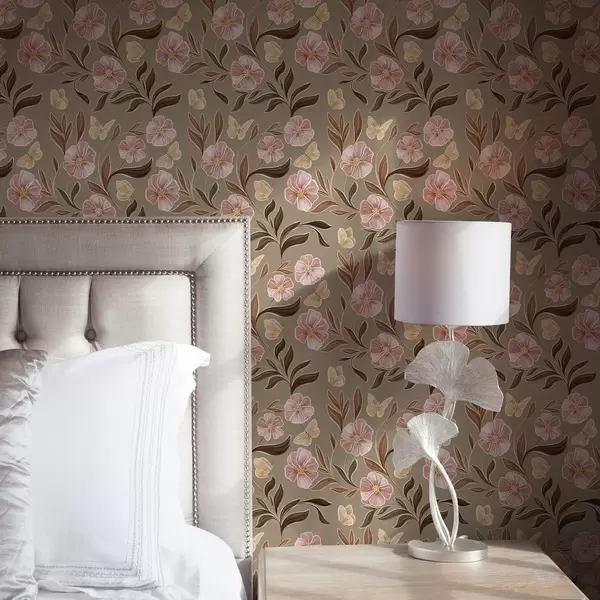 Papel de parede Flores cor-de-rosa e borboletas sobre um fundo bege-azeitona Nr. a00633v2