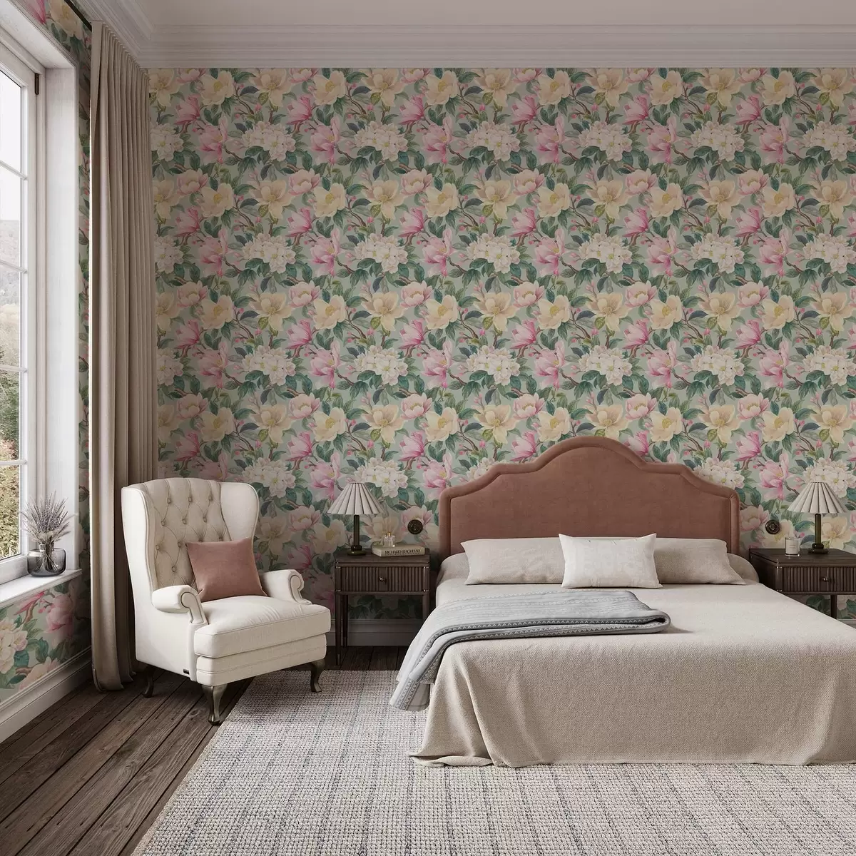Papel de parede Magnólias e flores brancas sobre um fundo cinza-menta Nr. a00644