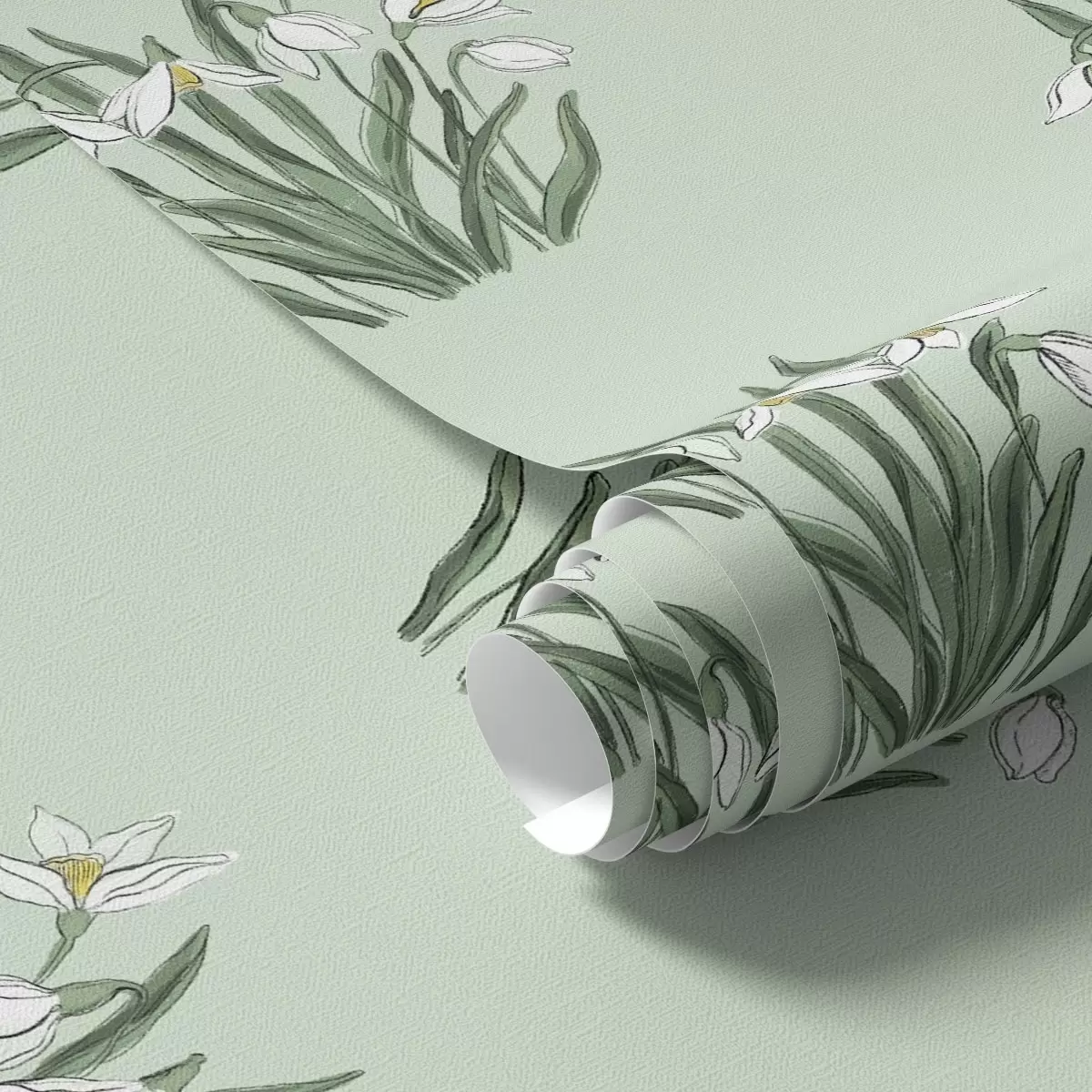 Papel de parede Snowdrops com folhas verdes sobre um fundo amarelo quente Nr. a00651v3