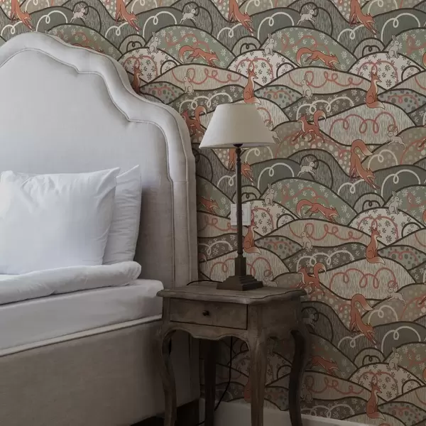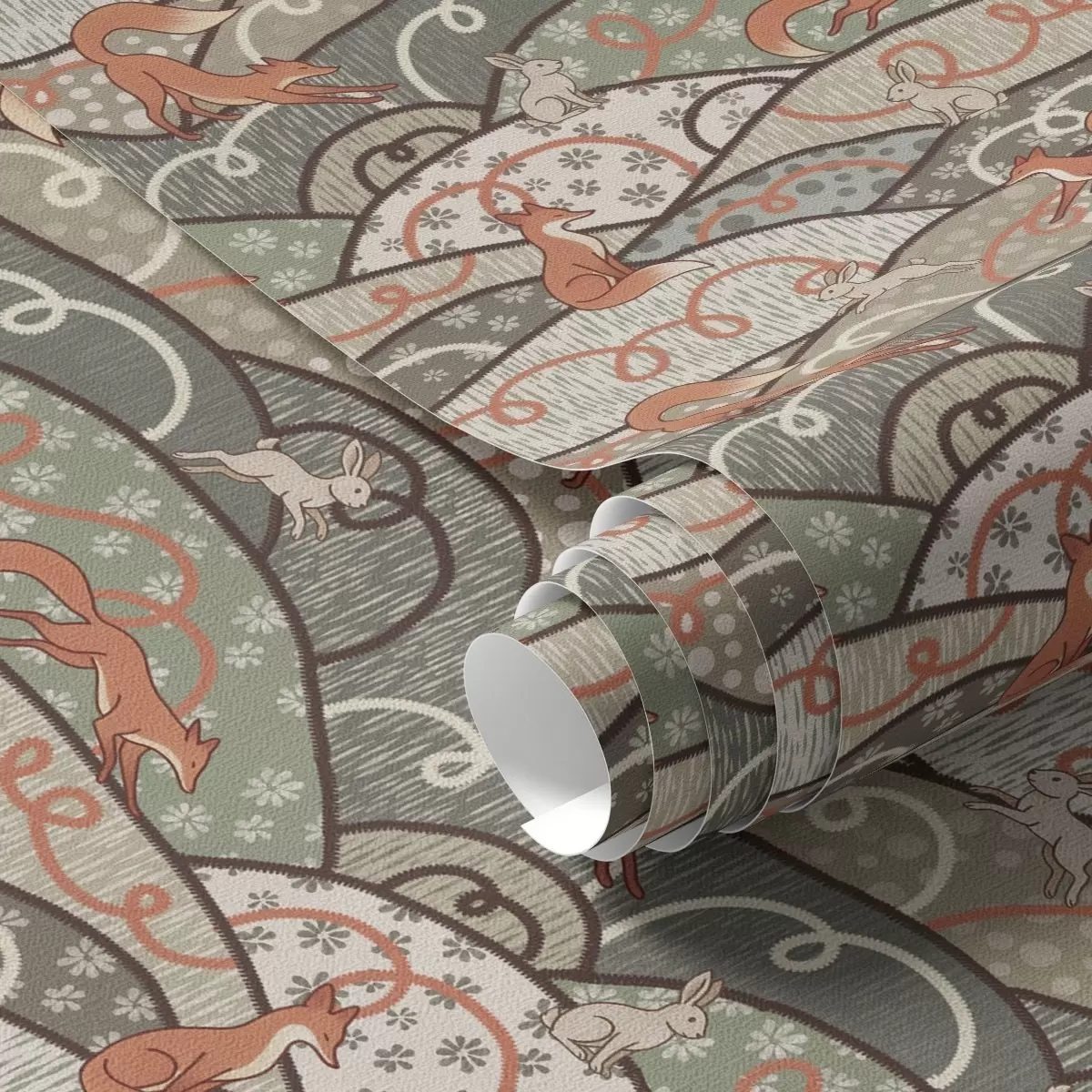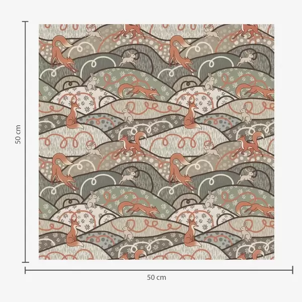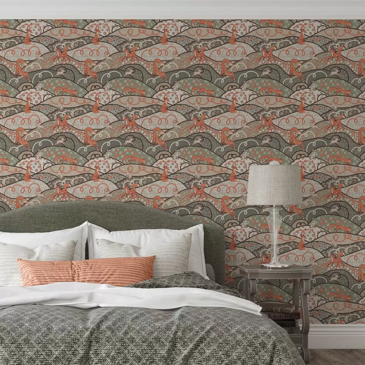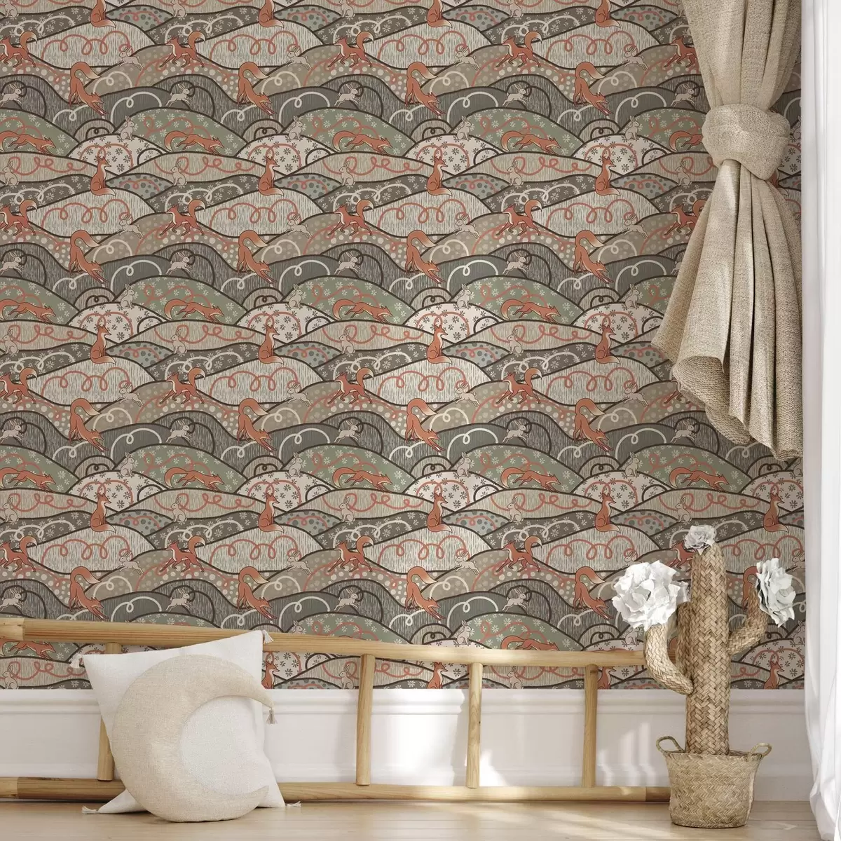 Papel de parede Raposas e lebres em colinas onduladas, padrão retro Nr. a00690