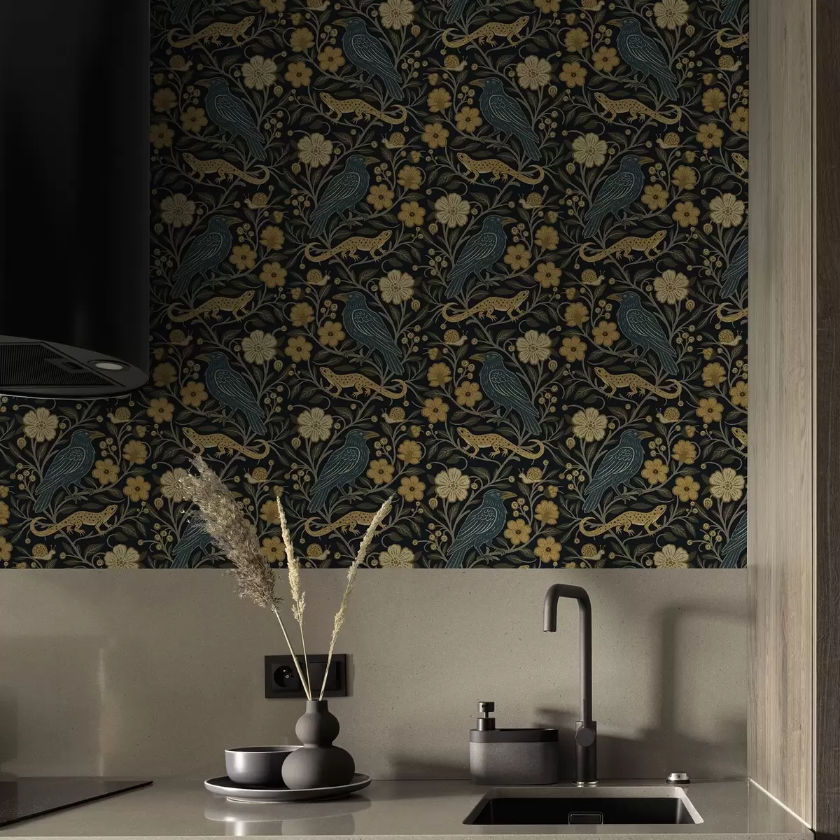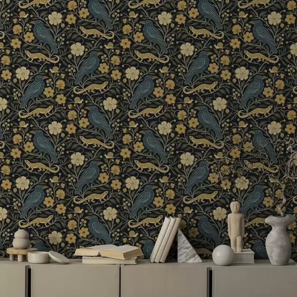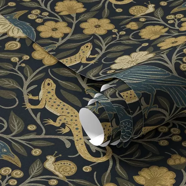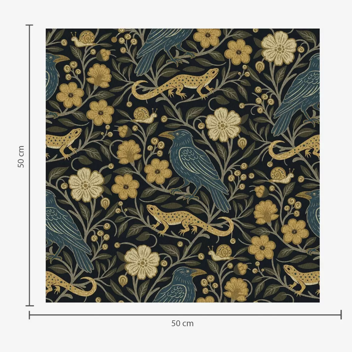 Papel de parede Pássaros, lagartos e caracóis entre flores num fundo escuro Nr. a00691