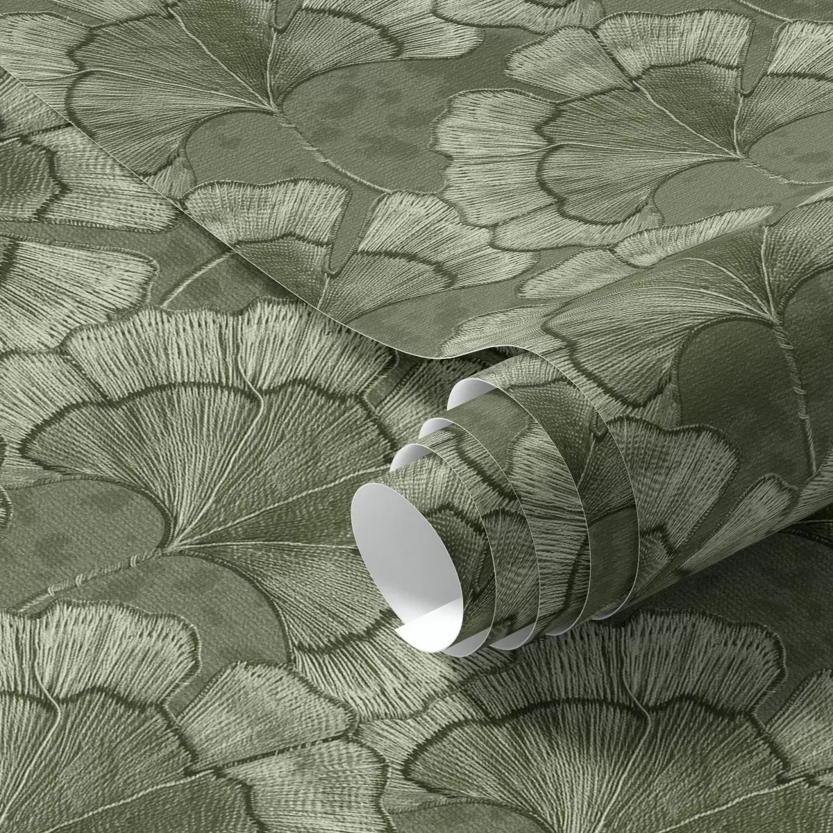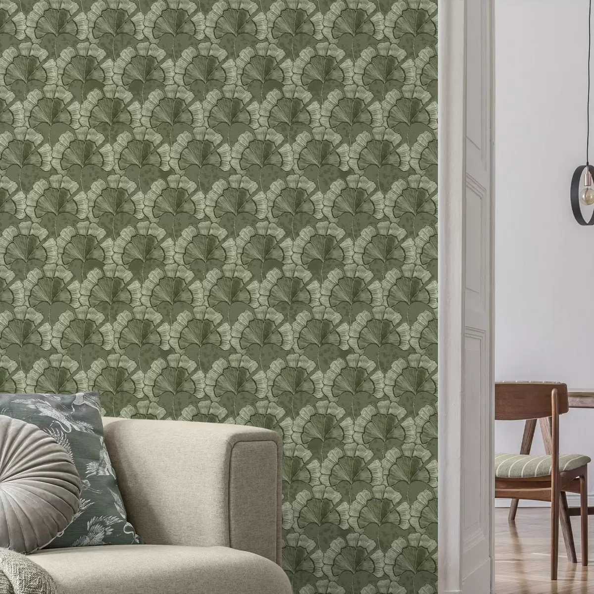 Papel de parede Padrão gráfico com ginkgo numa paleta de verdes frescos Nr. a00709