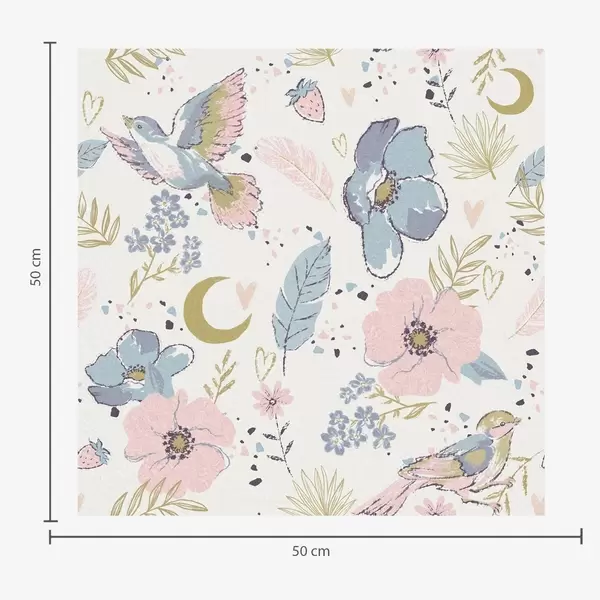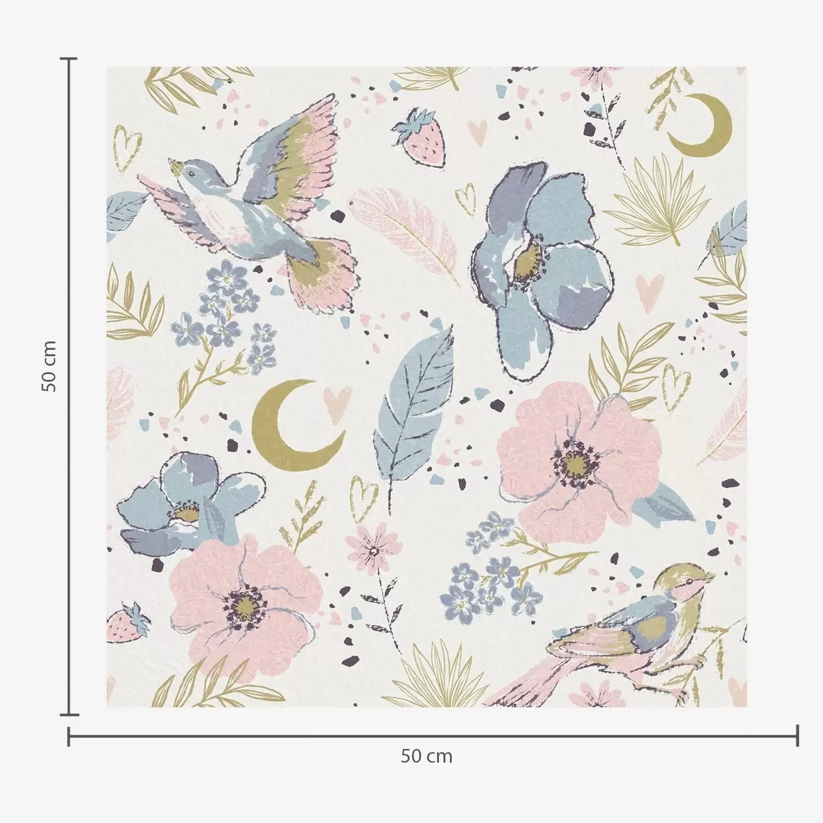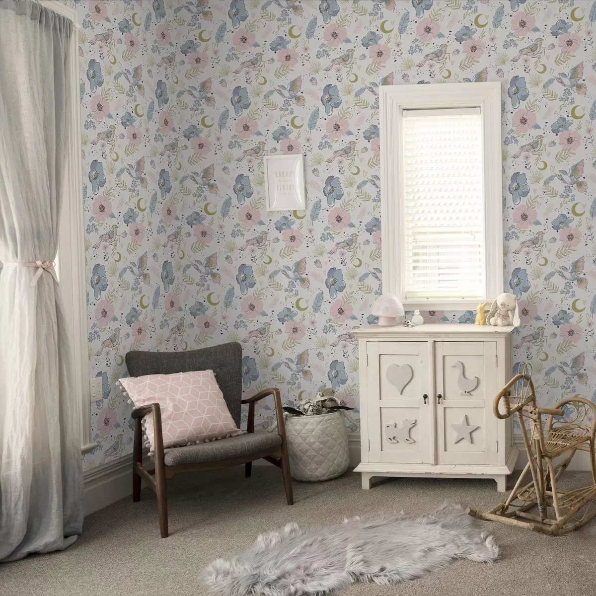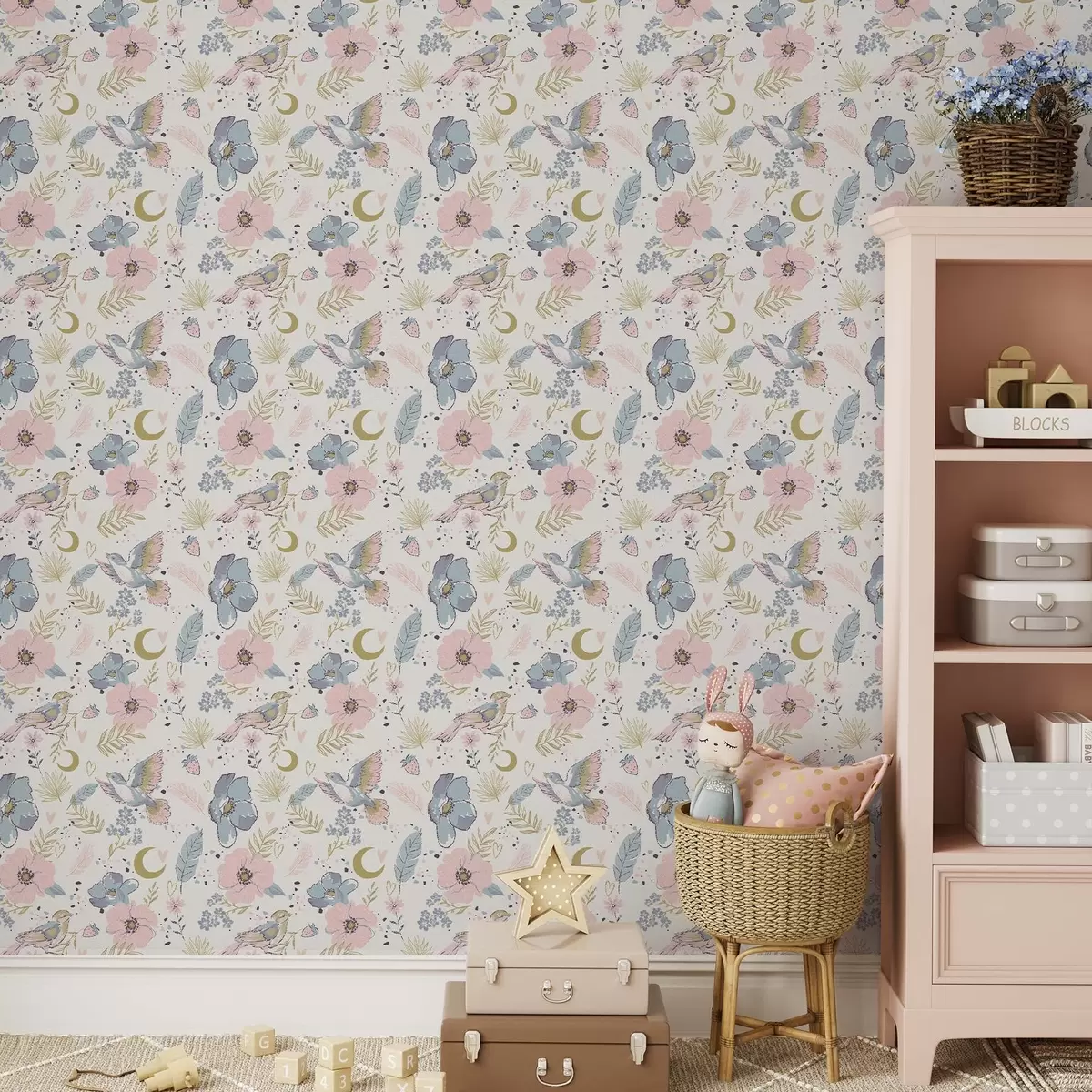 Papel de parede Pássaros e flores em tons pastel com luas crescentes sobre fundo branco Nr. a00721
