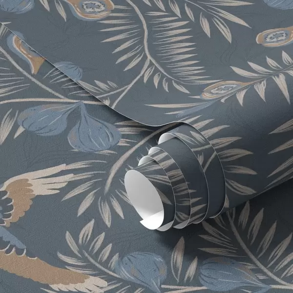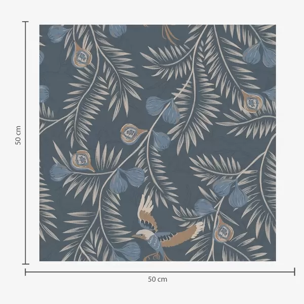 Papel de parede Pássaro entre frutos azuis e folhas de palmeira, índigo Nr. a00726