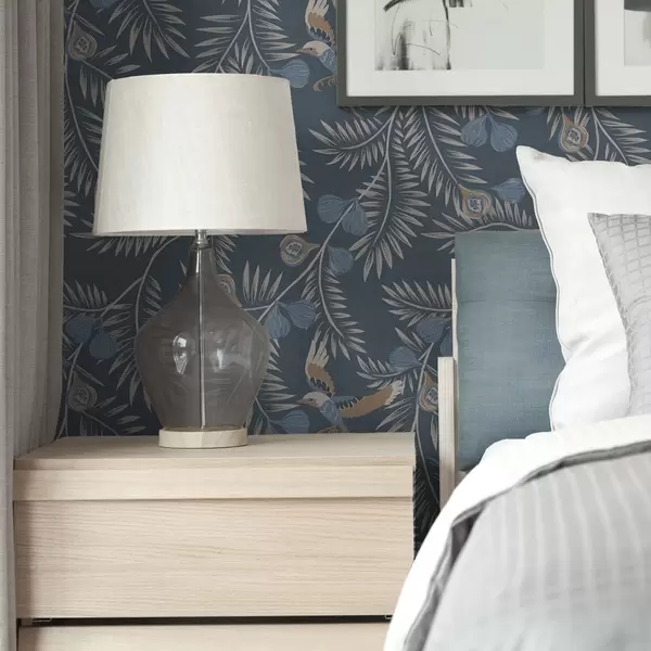 Papel de parede Pássaro entre frutos azuis e folhas de palmeira, índigo Nr. a00726
