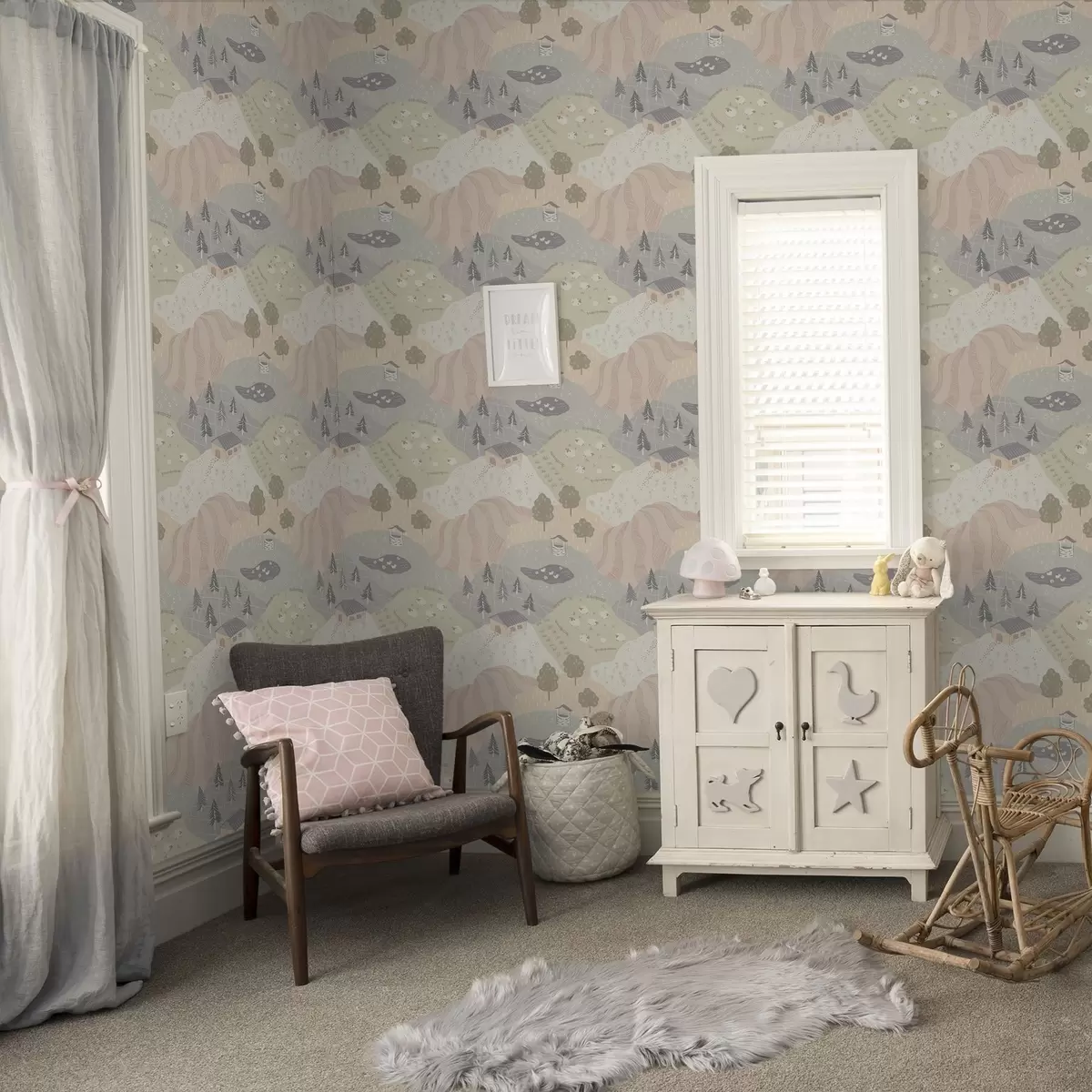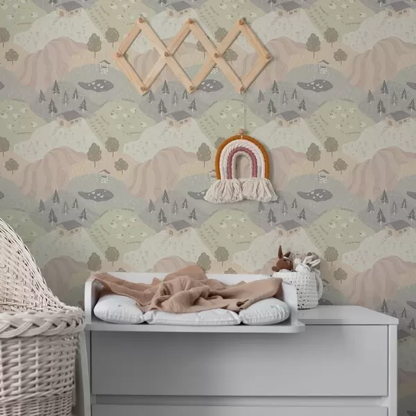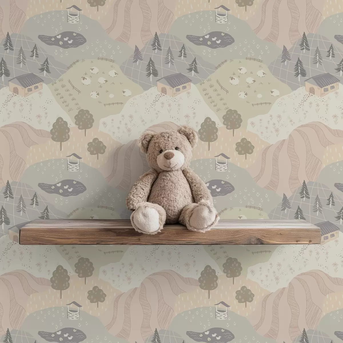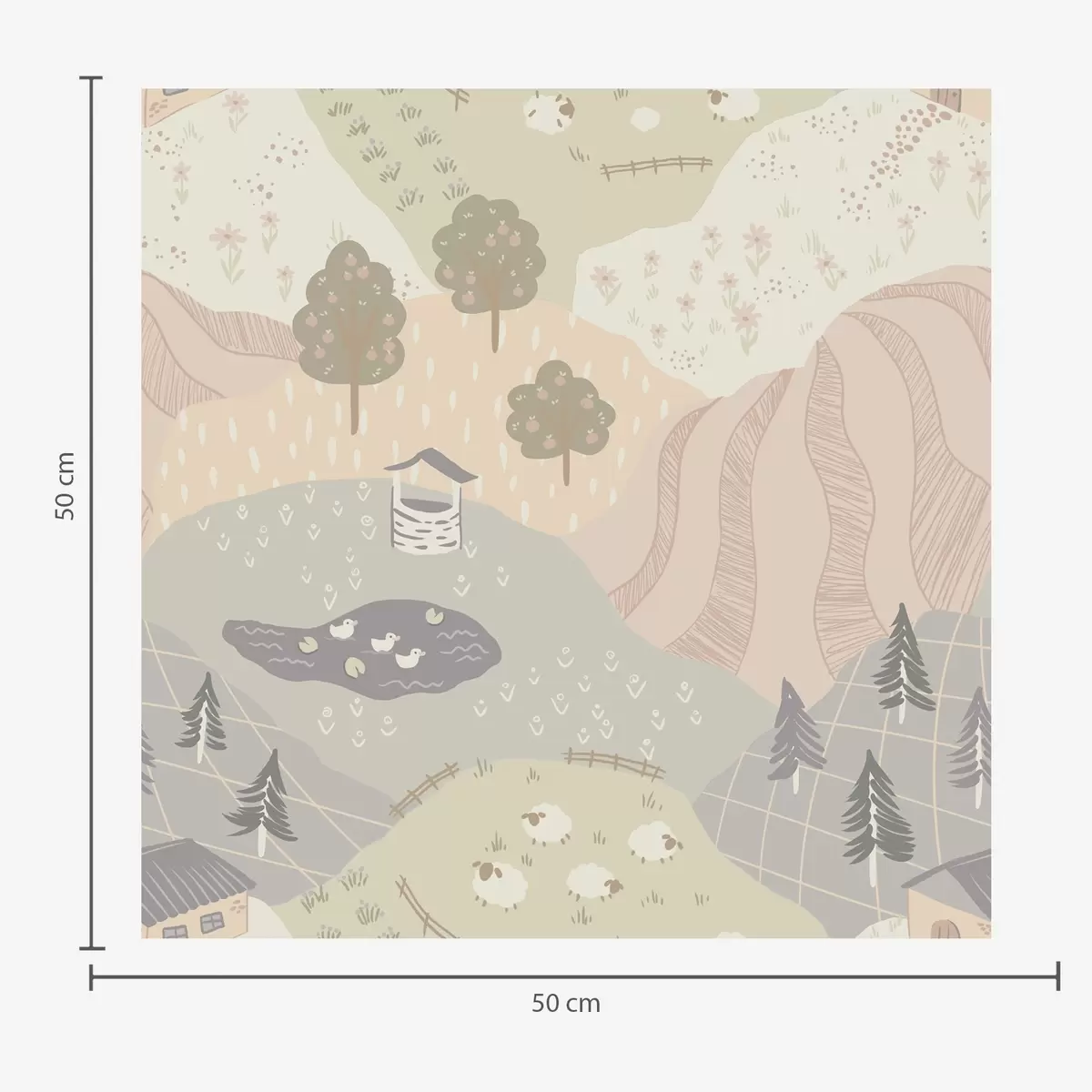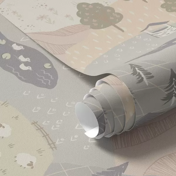 Papel de parede Campo de conto de fadas com árvores, gansos e ovelhas Nr. a00728