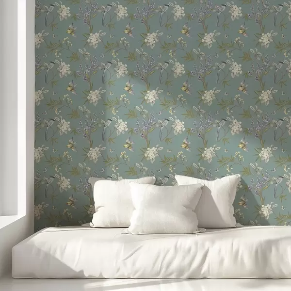 Papel de parede Pássaros, flores e borboletas sobre um fundo azul-acinzentado Nr. a00735