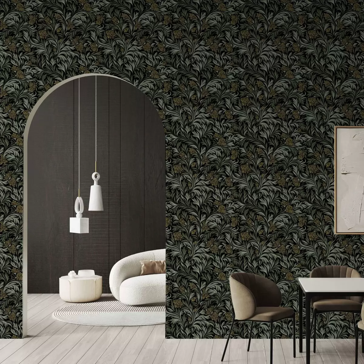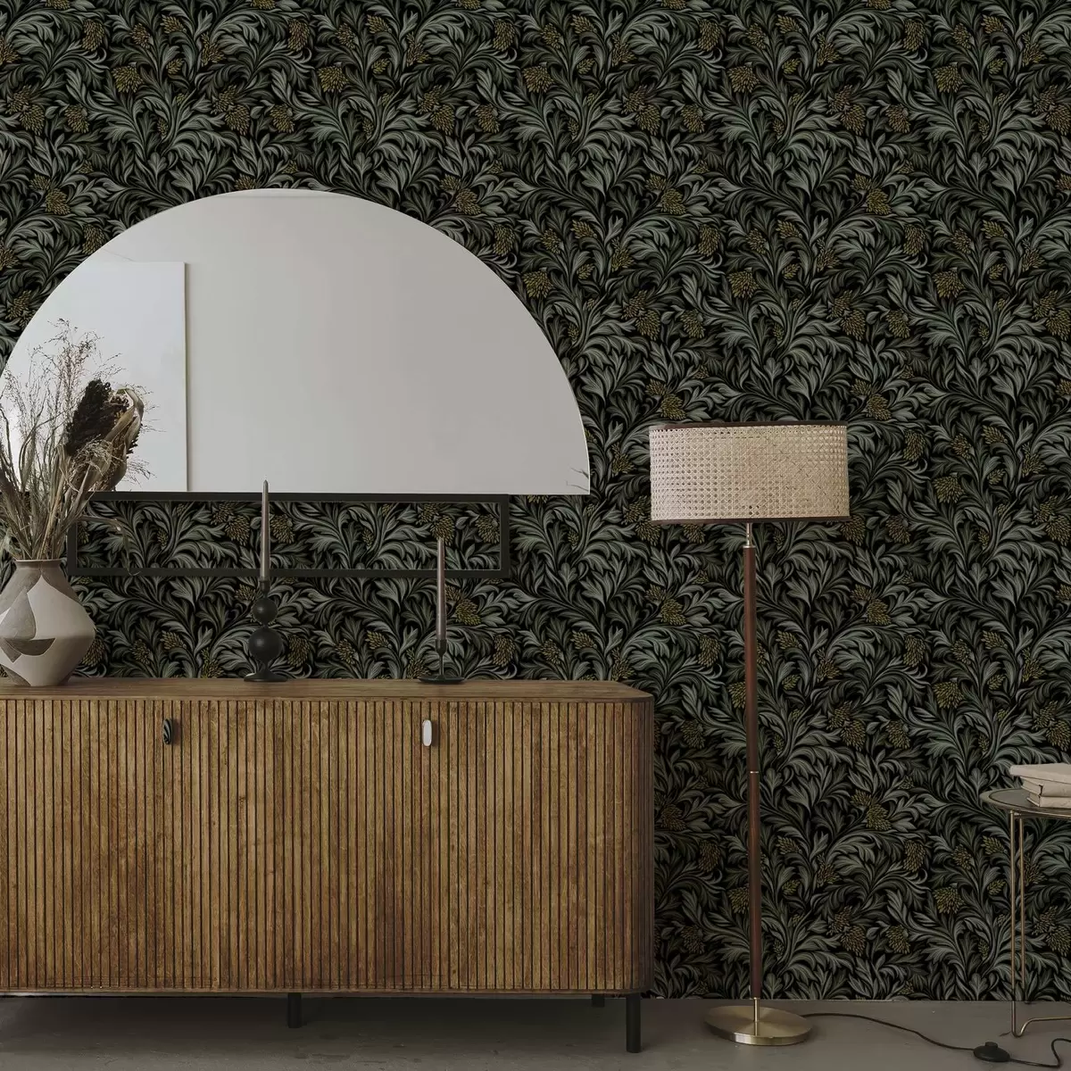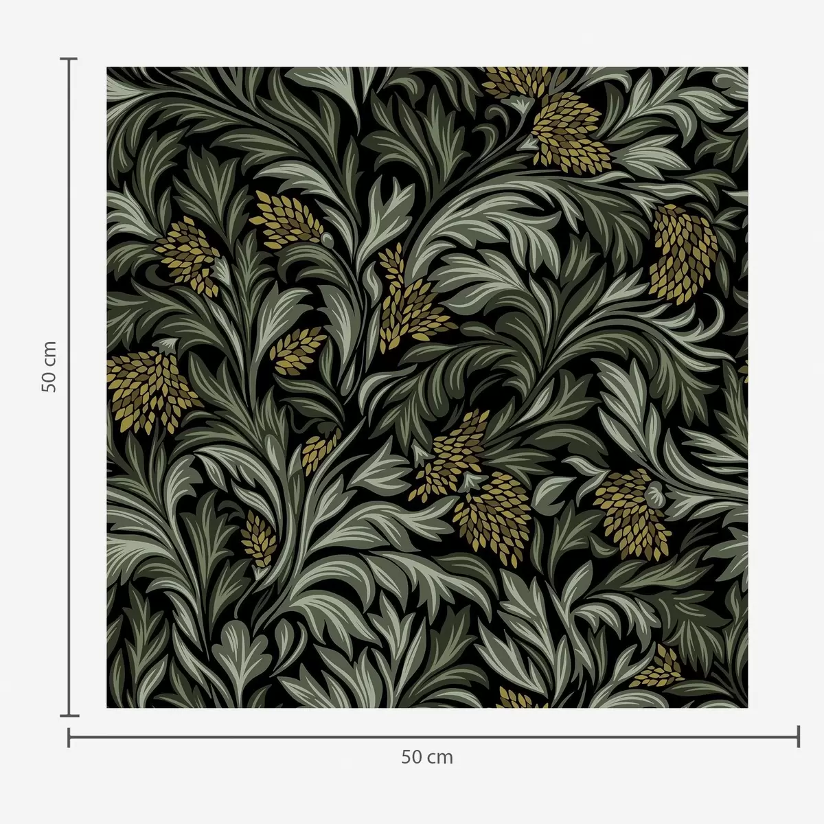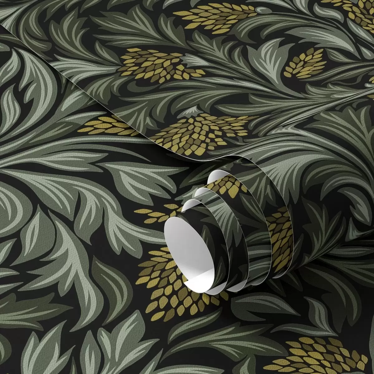 Papel de parede Folhas escuras de acanto com cones amarelos sobre fundo preto Nr. a00745