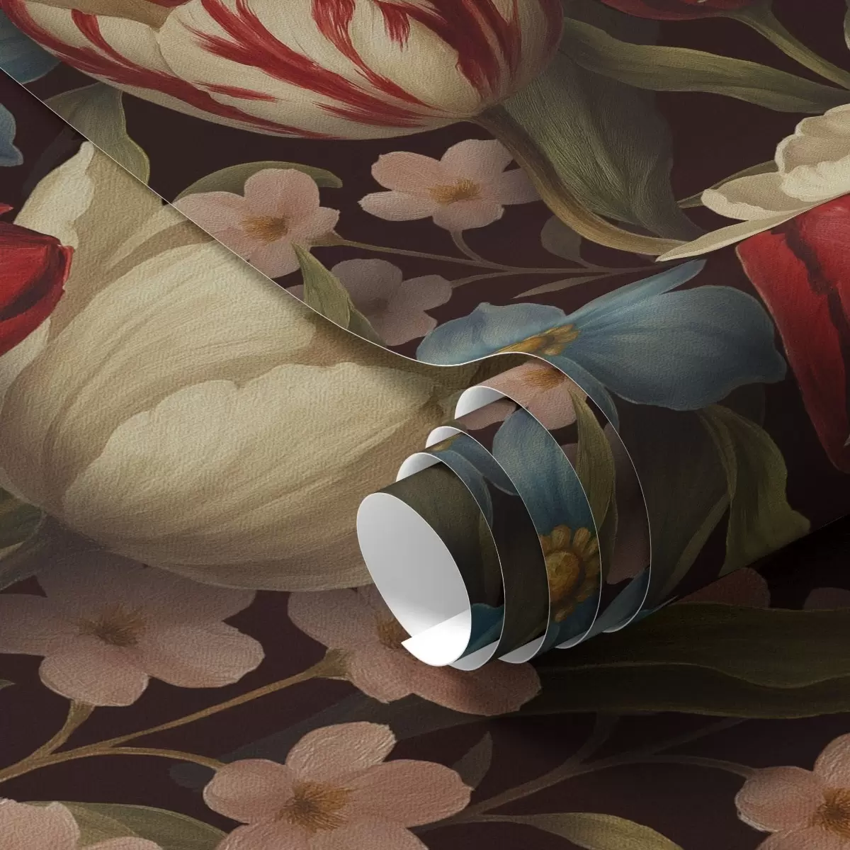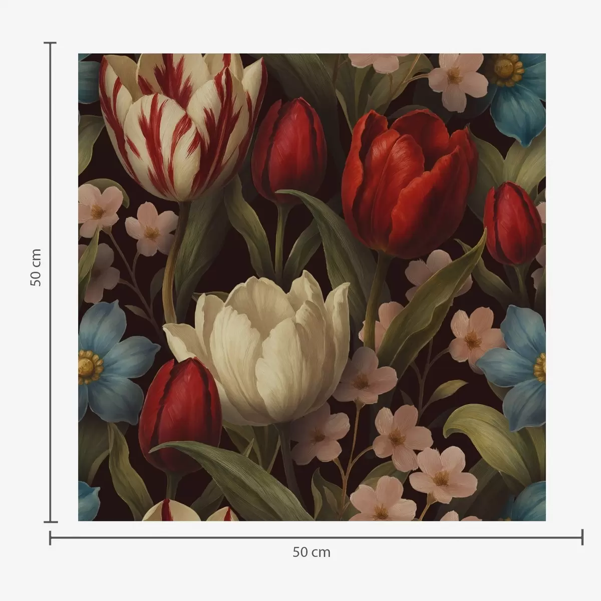 Papel de parede Tulipas brilhantes e flores azuis sobre fundo escuro Nr. a00746