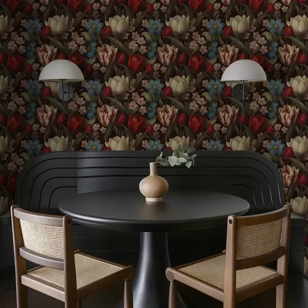 Papel de parede Tulipas brilhantes e flores azuis sobre fundo escuro Nr. a00746