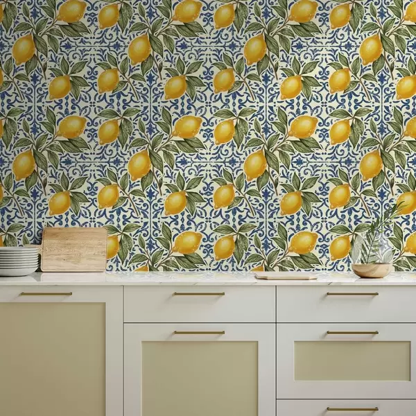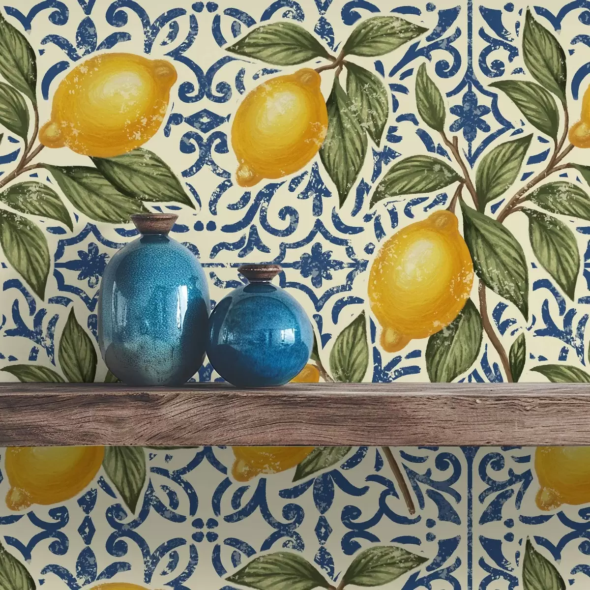 Papel de parede Ramos de limão com fundo ornamental azul Nr. a00763