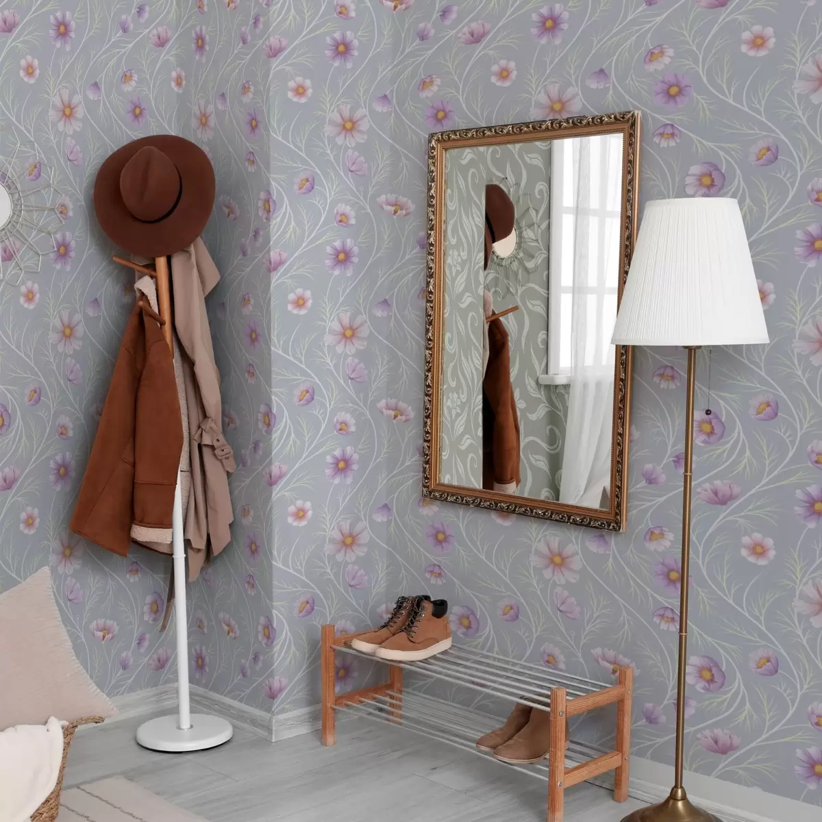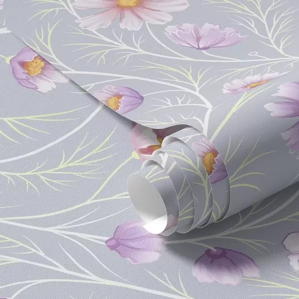 Papel de parede Cosmos rosa e hastes delgadas sobre fundo cinzento Nr. a00791
