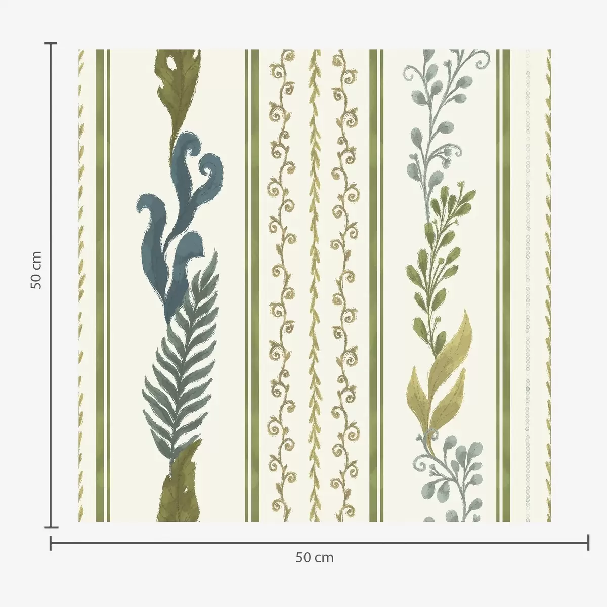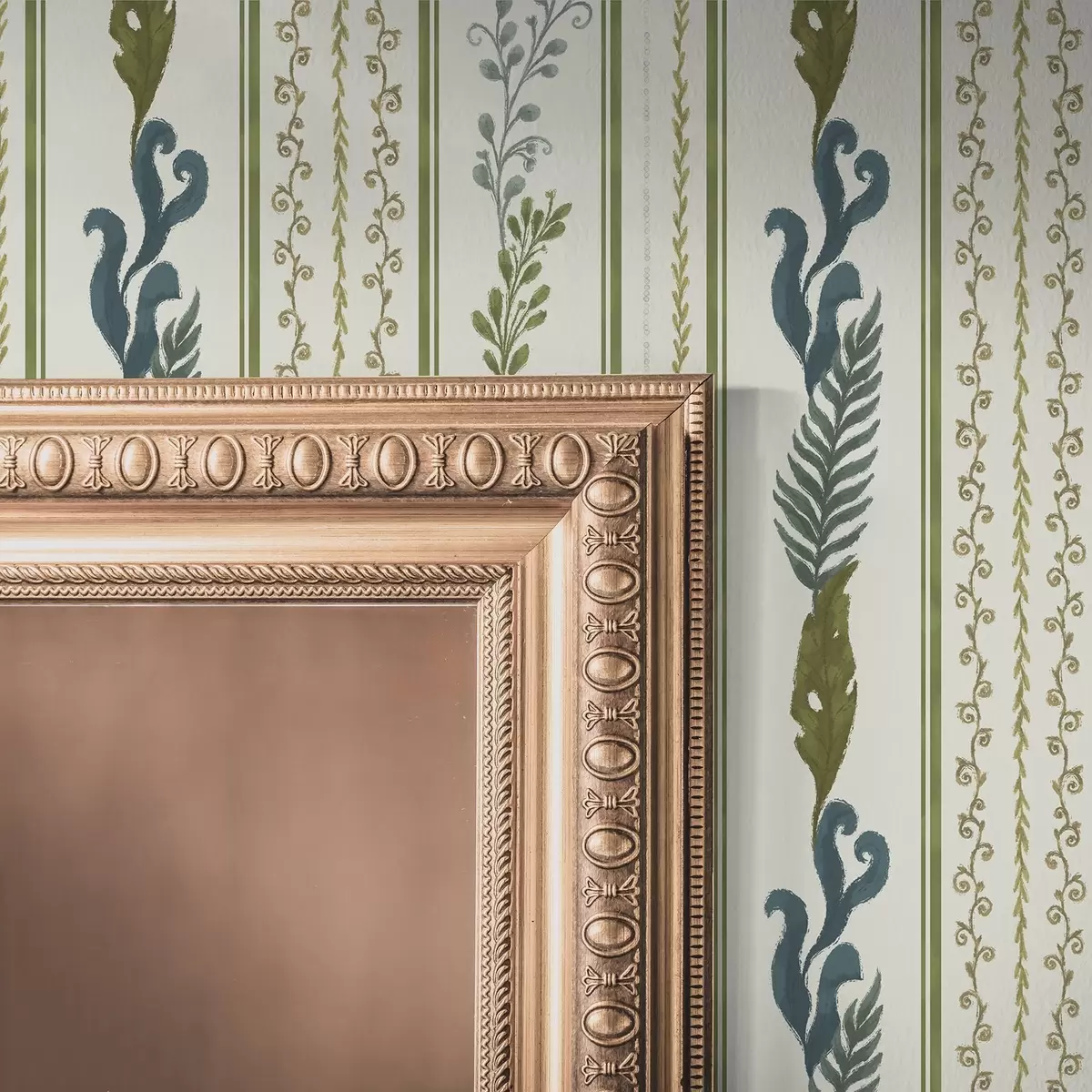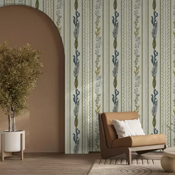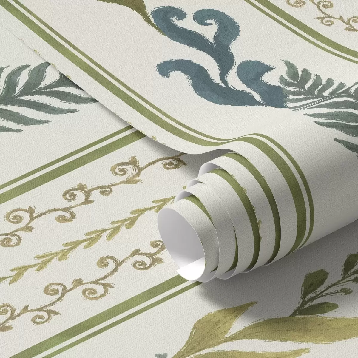 Papel de parede Listras com ornamentos em espiral e grandes ramos em tons de verde Nr. a00823