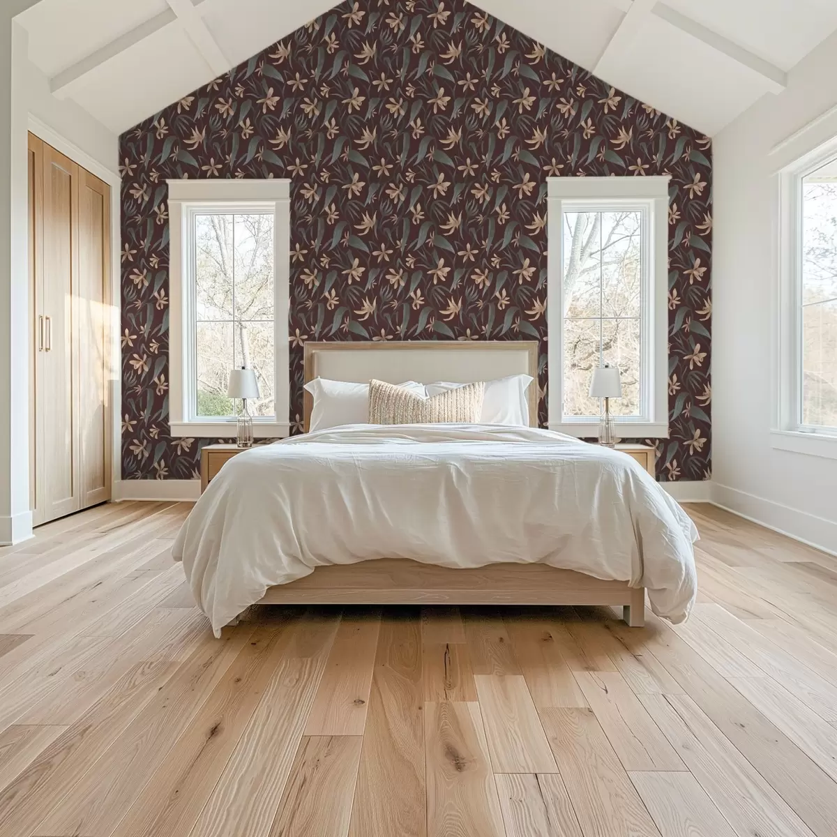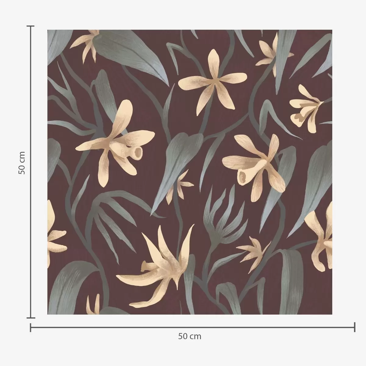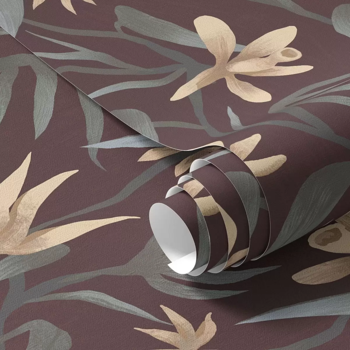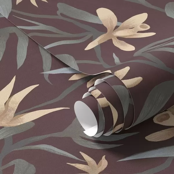 Papel de parede Flores creme com folhas cinzentas sobre fundo bordô Nr. a00833