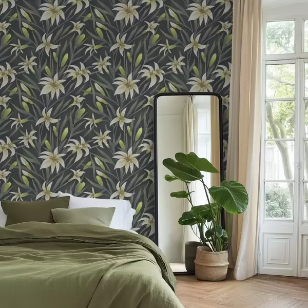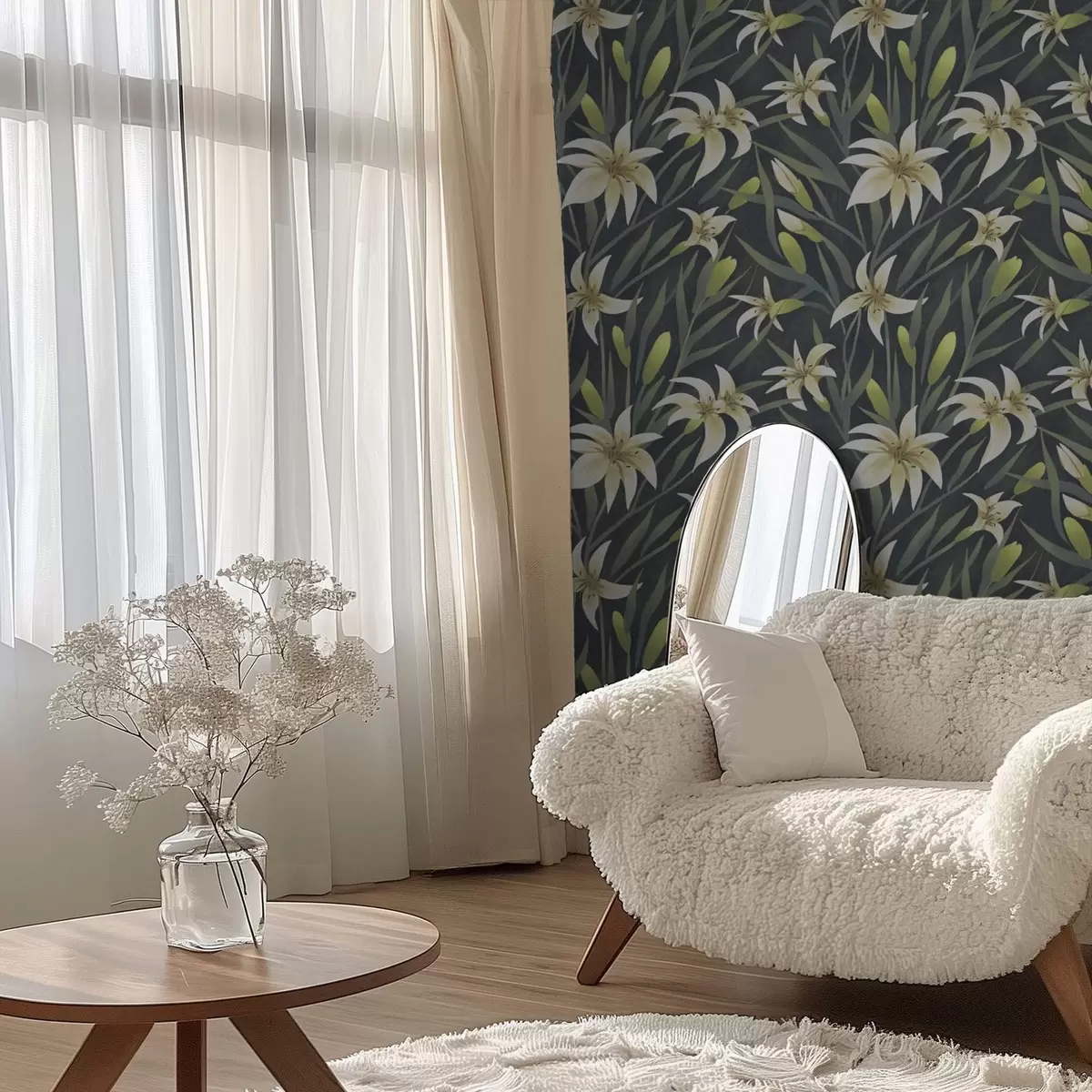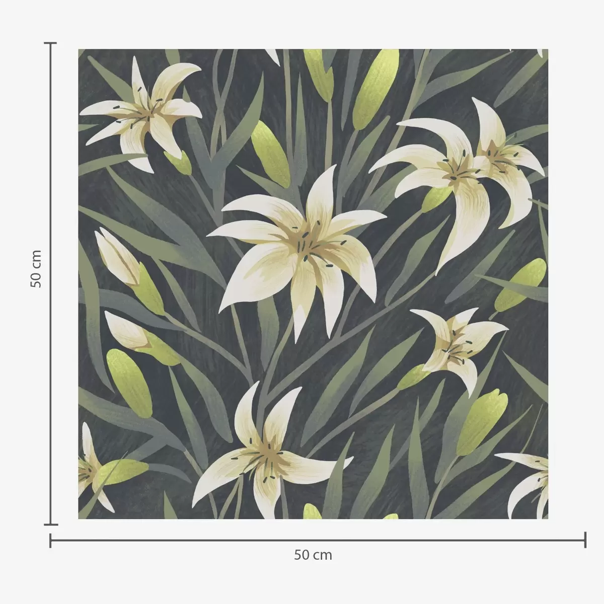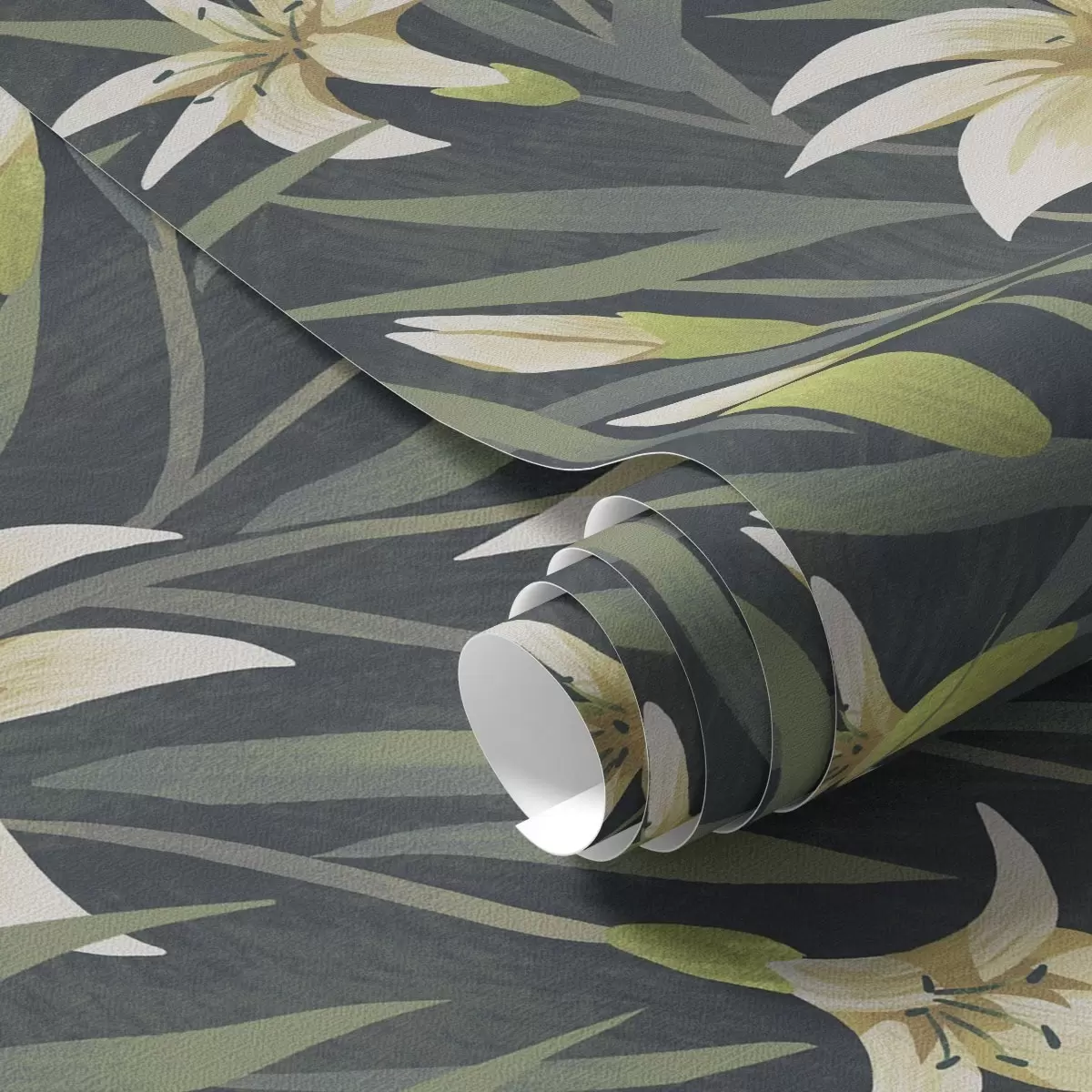 Papel de parede Lírios creme com folhas sobre fundo escuro Nr. a00837v1