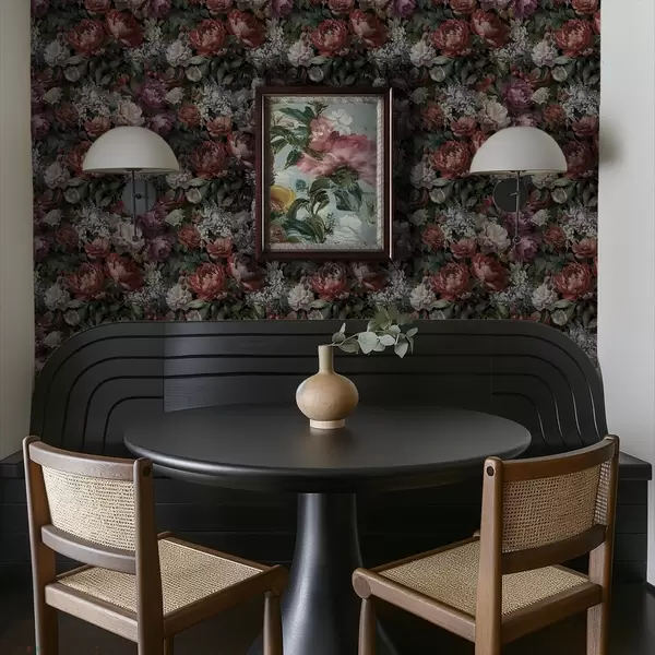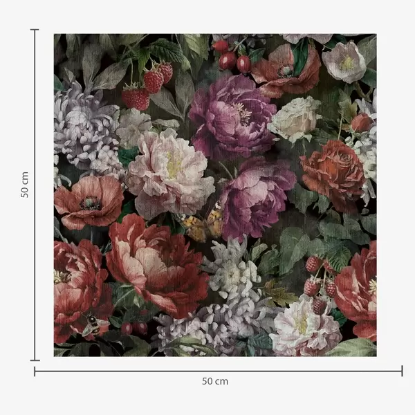 Papel de parede Peônias dramáticas escuras, bagas e borboleta sobre fundo preto Nr. a00862