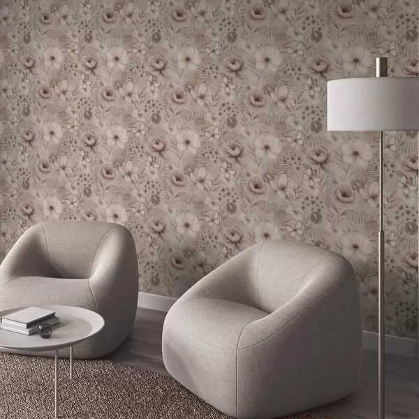 Papel de parede Florais bege sépia com detalhes lineares e borboletas Nr. a00870