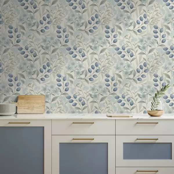 Papel de parede Mirtilos azuis e flores claras sobre marfim Nr. a00872