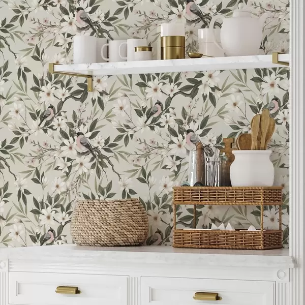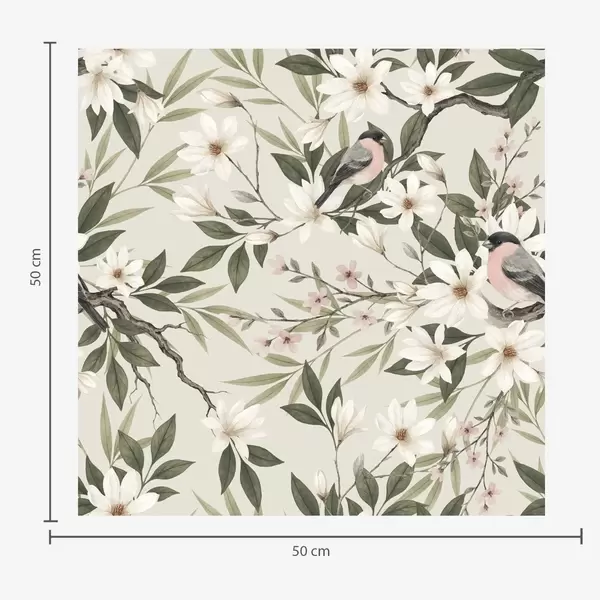 Papel de parede Pintassilgos com peitos brancos em ramos com flores creme Nr. a00889