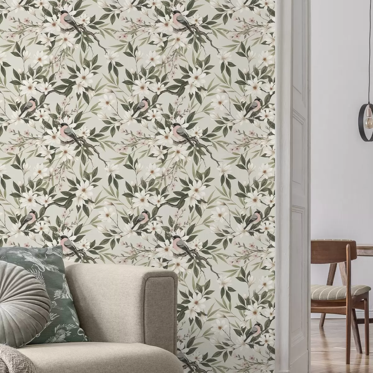 Papel de parede Pintassilgos com peitos brancos em ramos com flores creme Nr. a00889