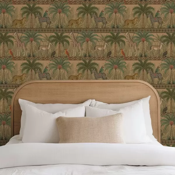Papel de parede Animais decorativos da savana entre palmeiras e bordas a00898