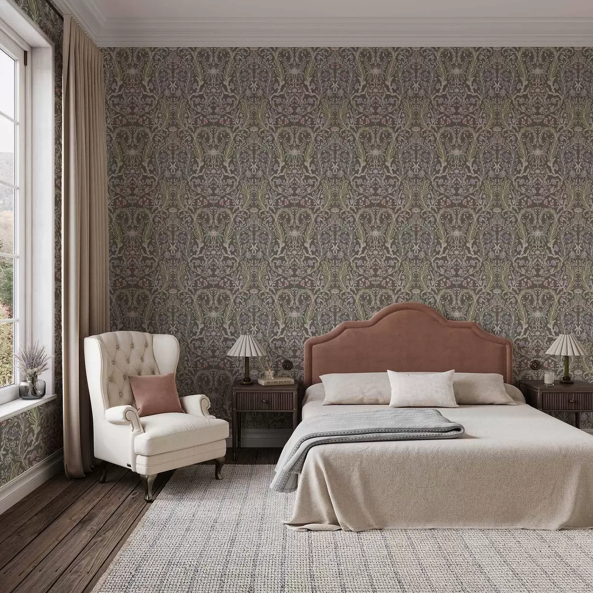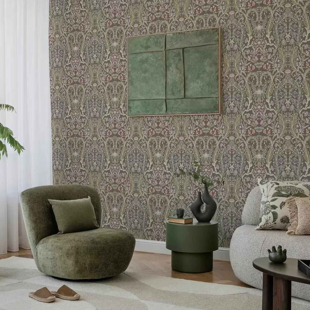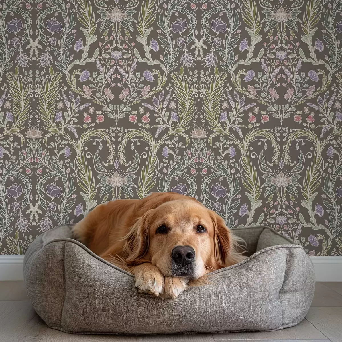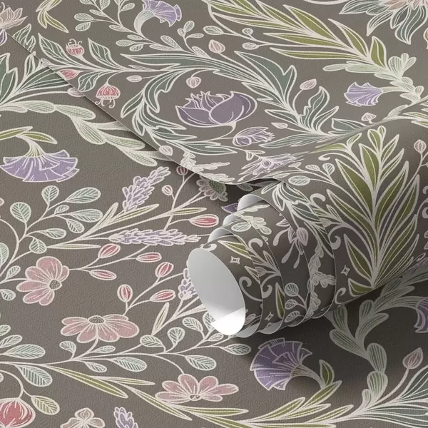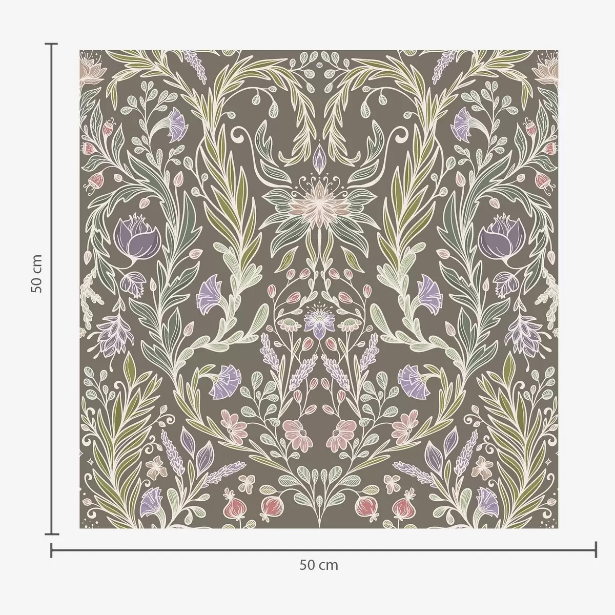Papel de parede Flores e folhas simétricas sobre um fundo cinza acastanhado Nr. a00928v2
