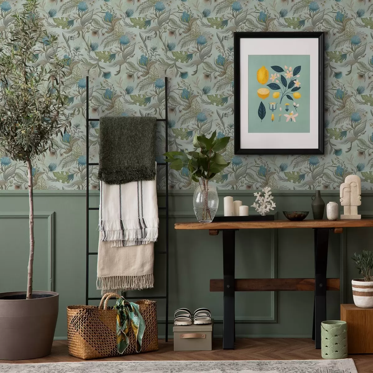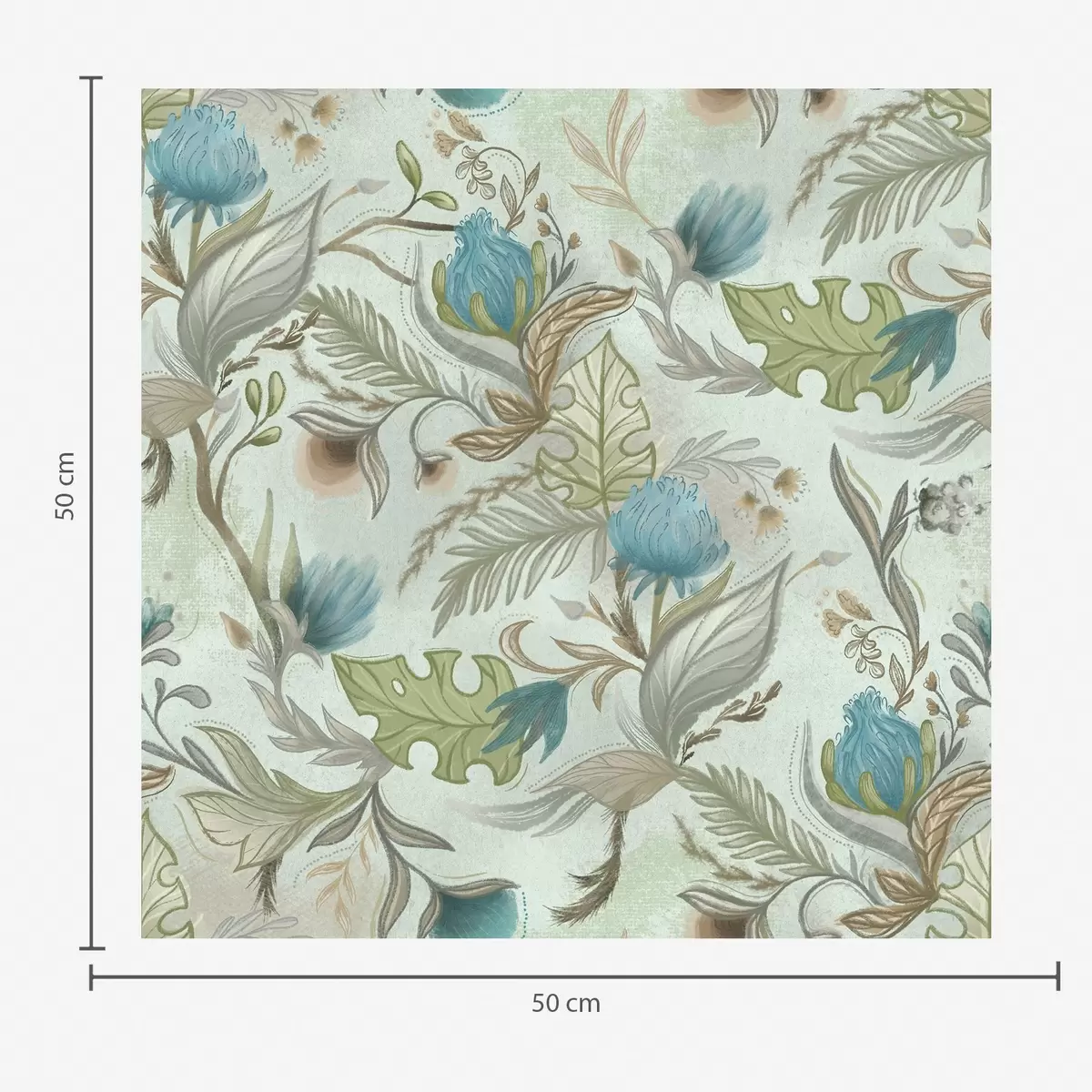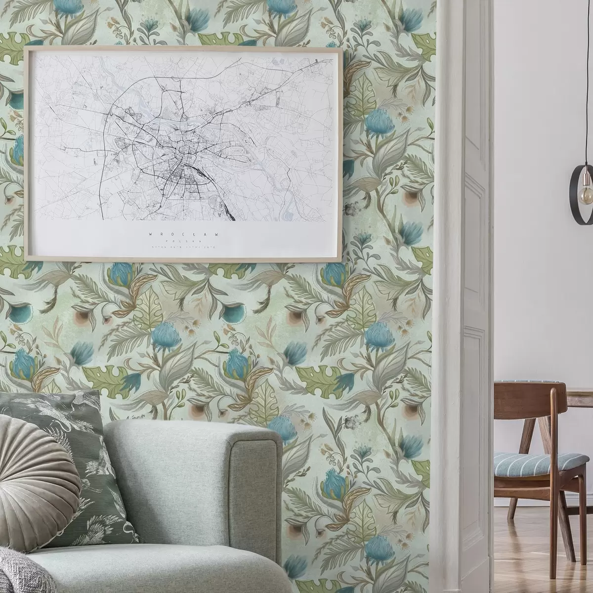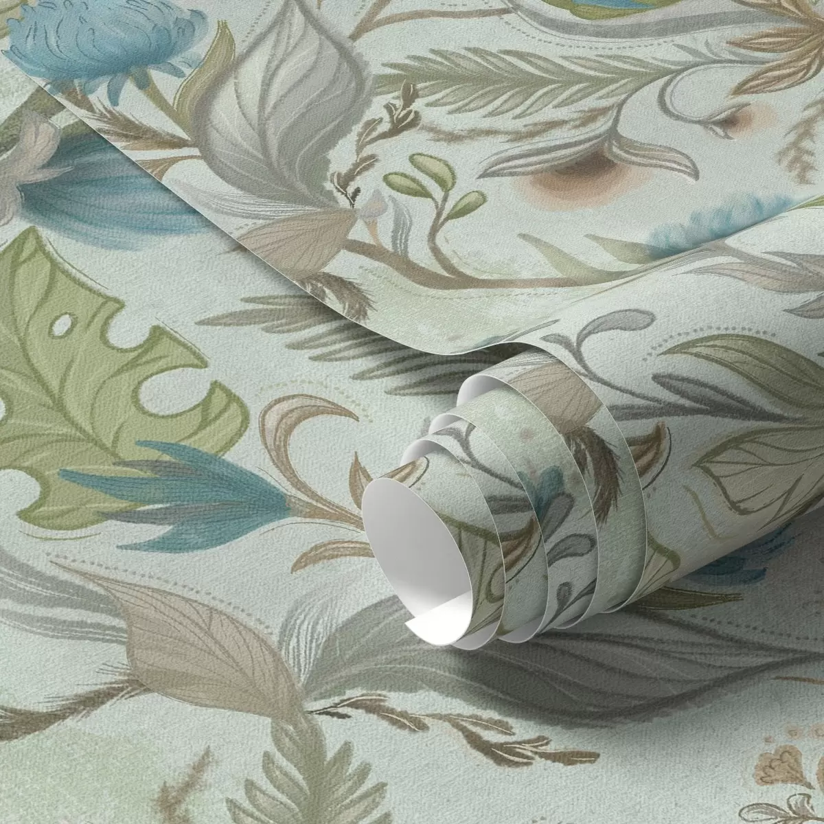 Papel de parede Flores azuis e folhagem sobre um fundo suave em tom menta Nr. a00930v1