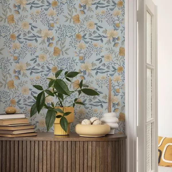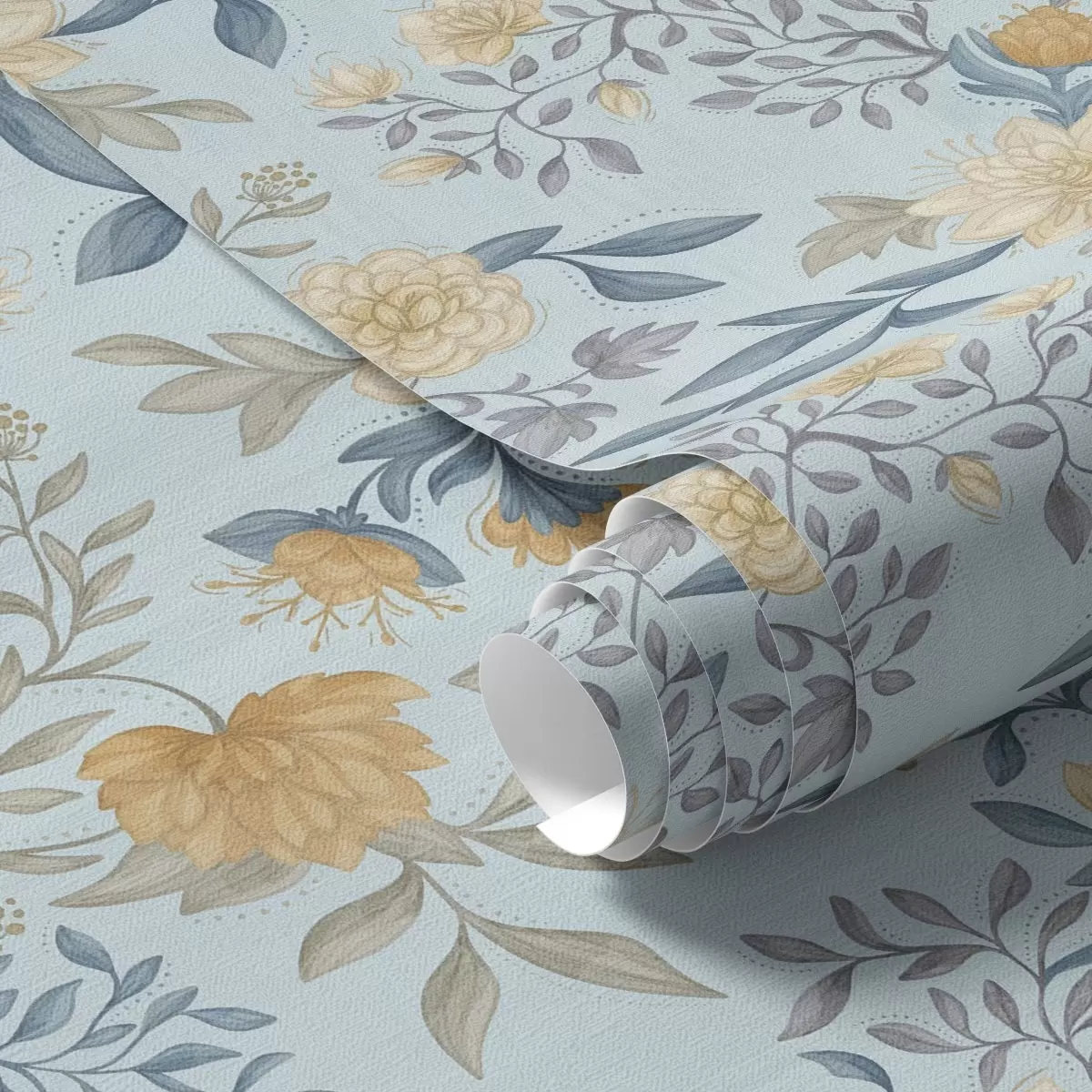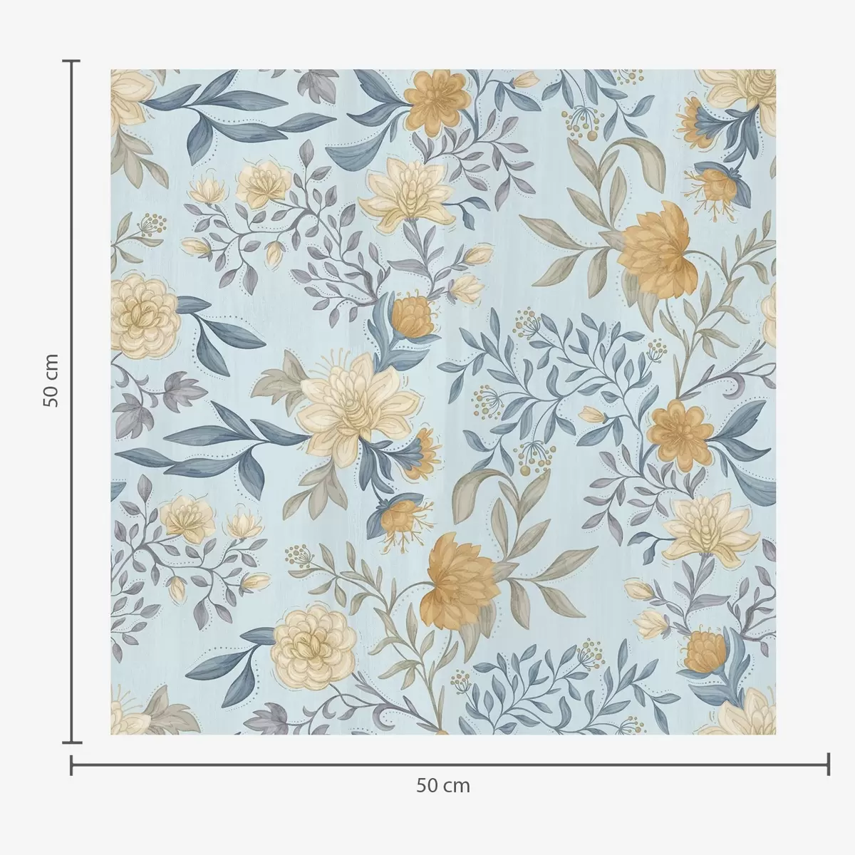 Papel de parede Flores amarelas e azuis com folhas sobre um fundo azul-celeste Nr. a00934