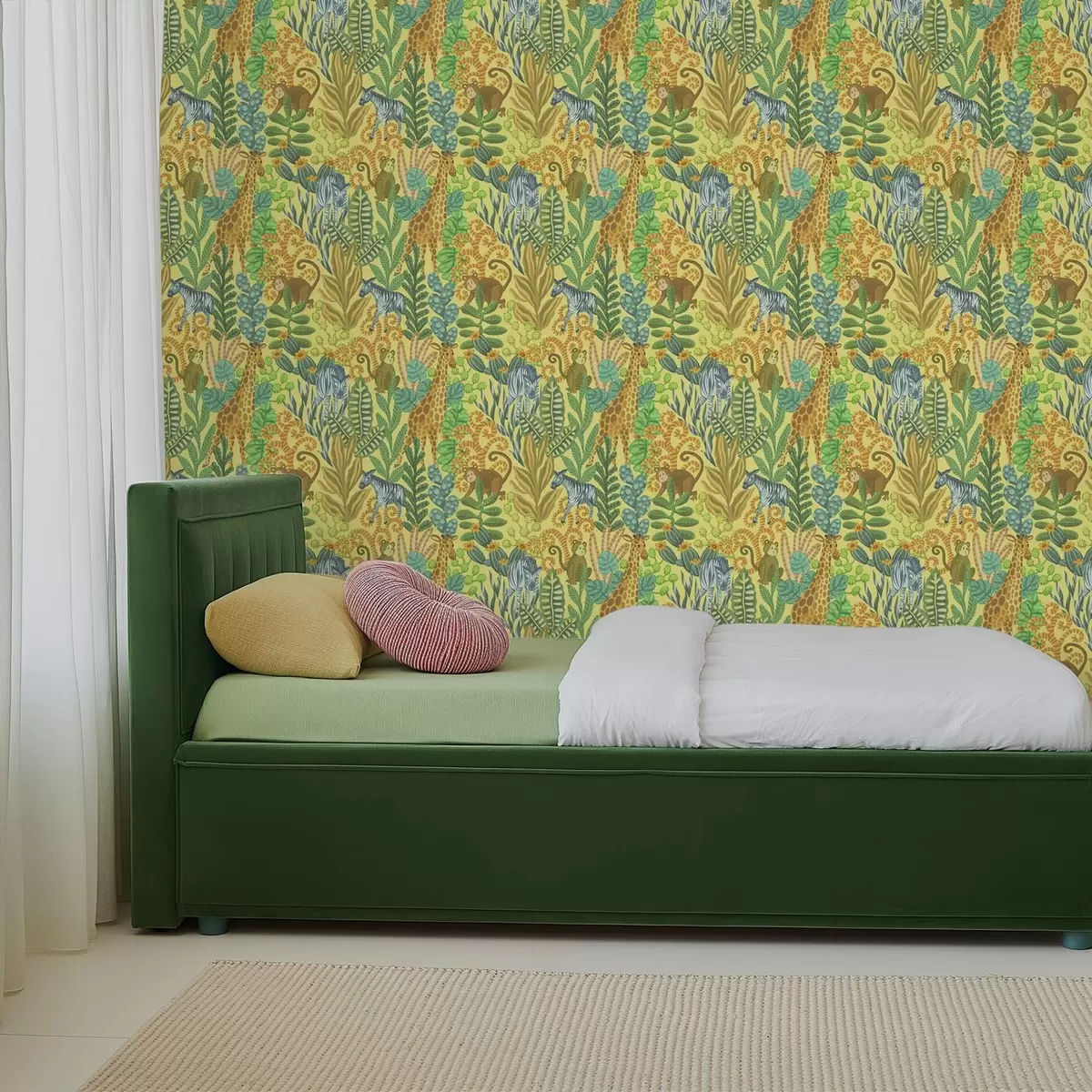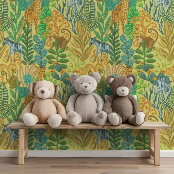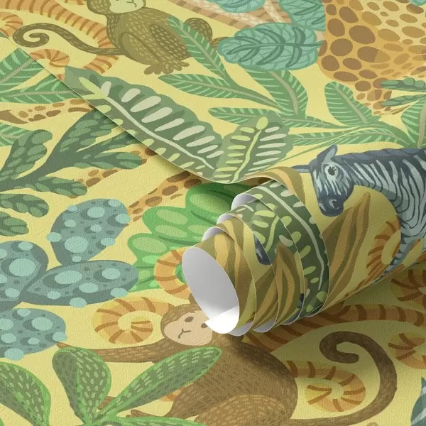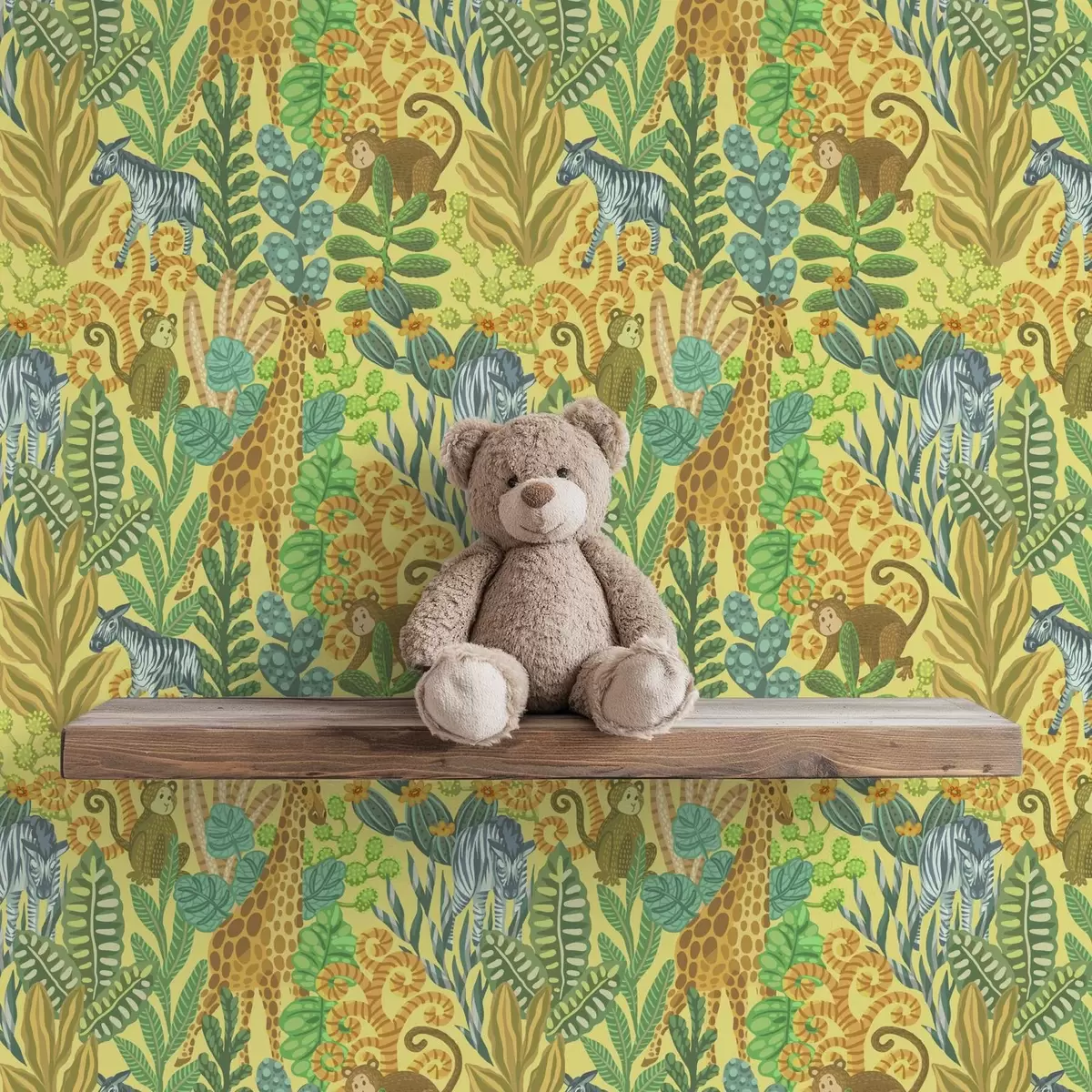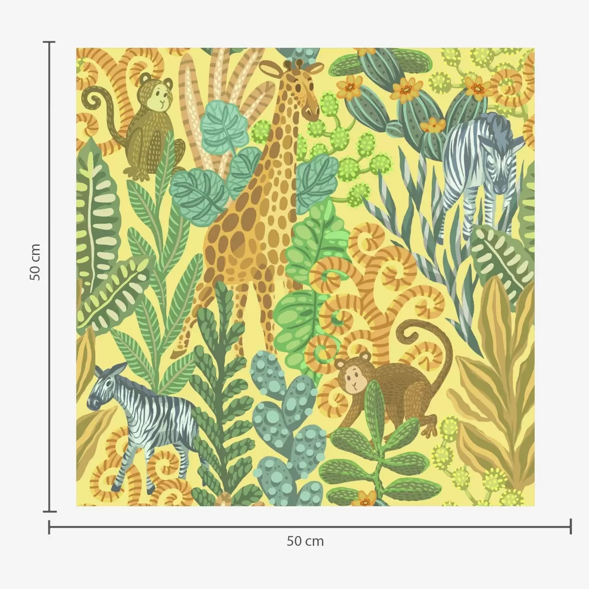 Papel de parede Girafa, zebra e macaco numa savana amarela brilhante Nr. a01000v1