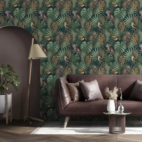 Papel de parede Macacos e pássaros tropicais na densa folhagem da selva Nr. a01037