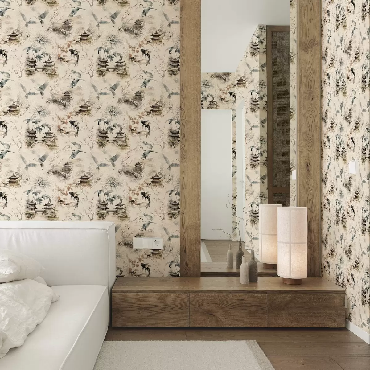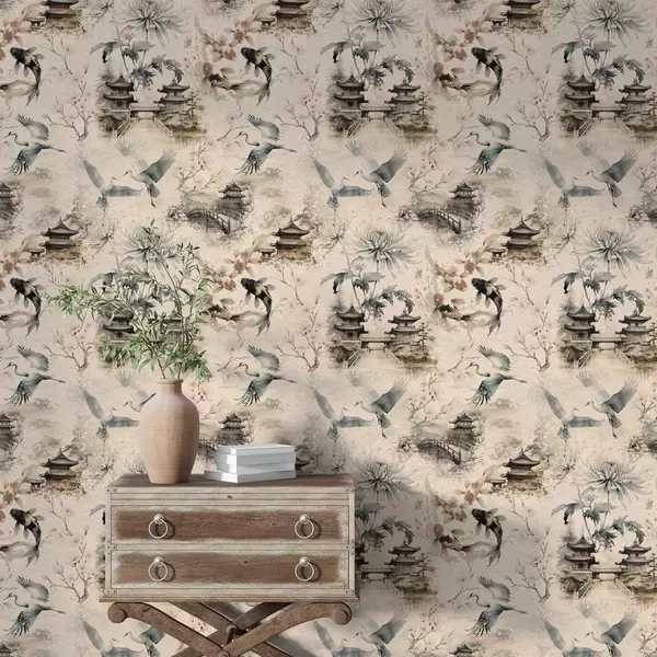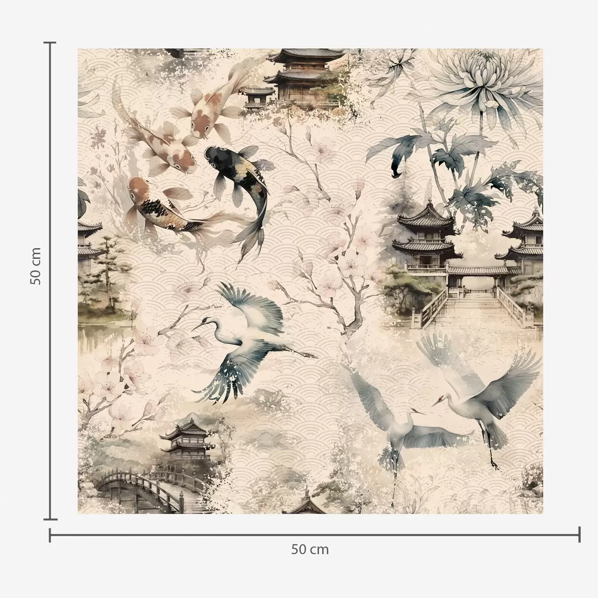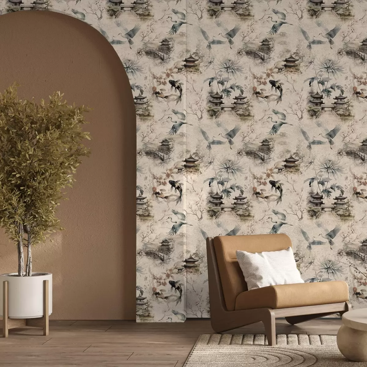Papel de parede Templos japoneses, peixes koi e garças num fundo suave Nr. a01040