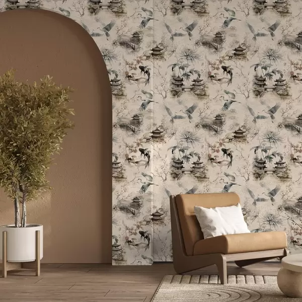 Papel de parede Templos japoneses, peixes koi e garças num fundo suave Nr. a01040