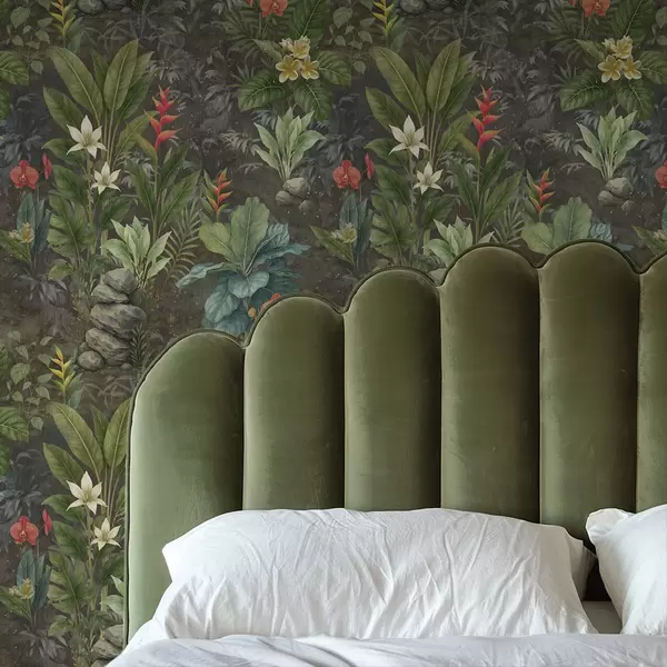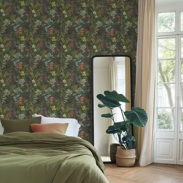 Papel de parede Jardim tropical escuro com flores e folhagens brilhantes Nr. a01079