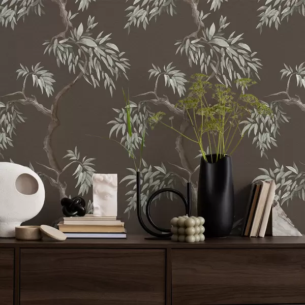 Papel de parede Ramo de árvore com folhas sobre fundo castanho a01117v3